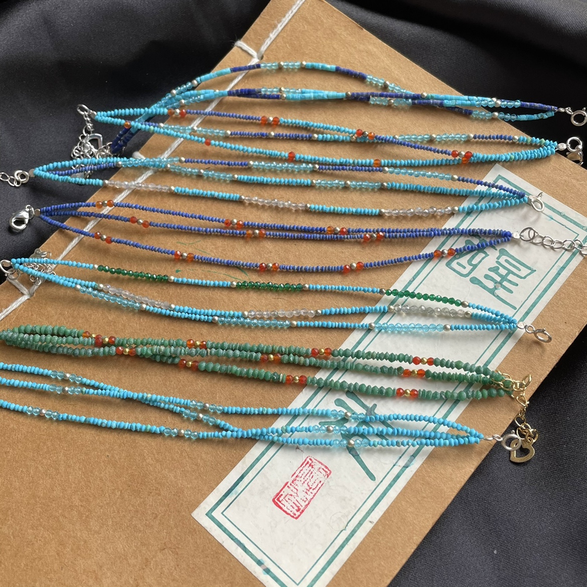 醒走阿富汗手工天然绿松石蓝松石蓝宝石青金石极细小米珠三圈手链