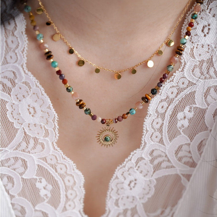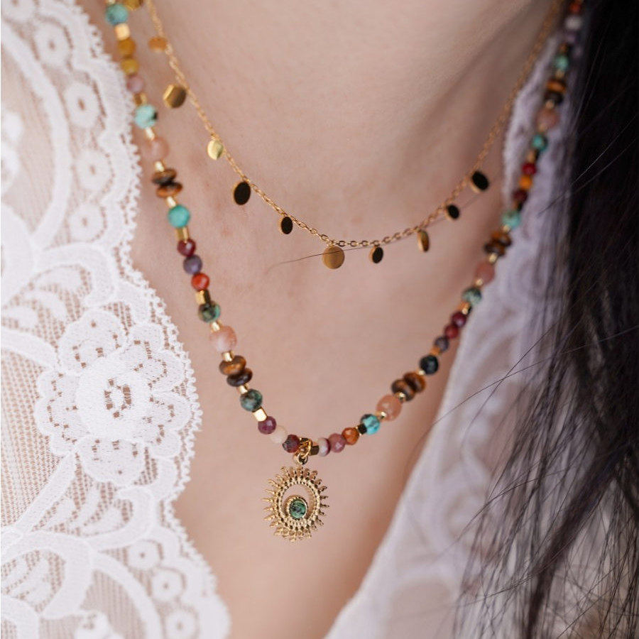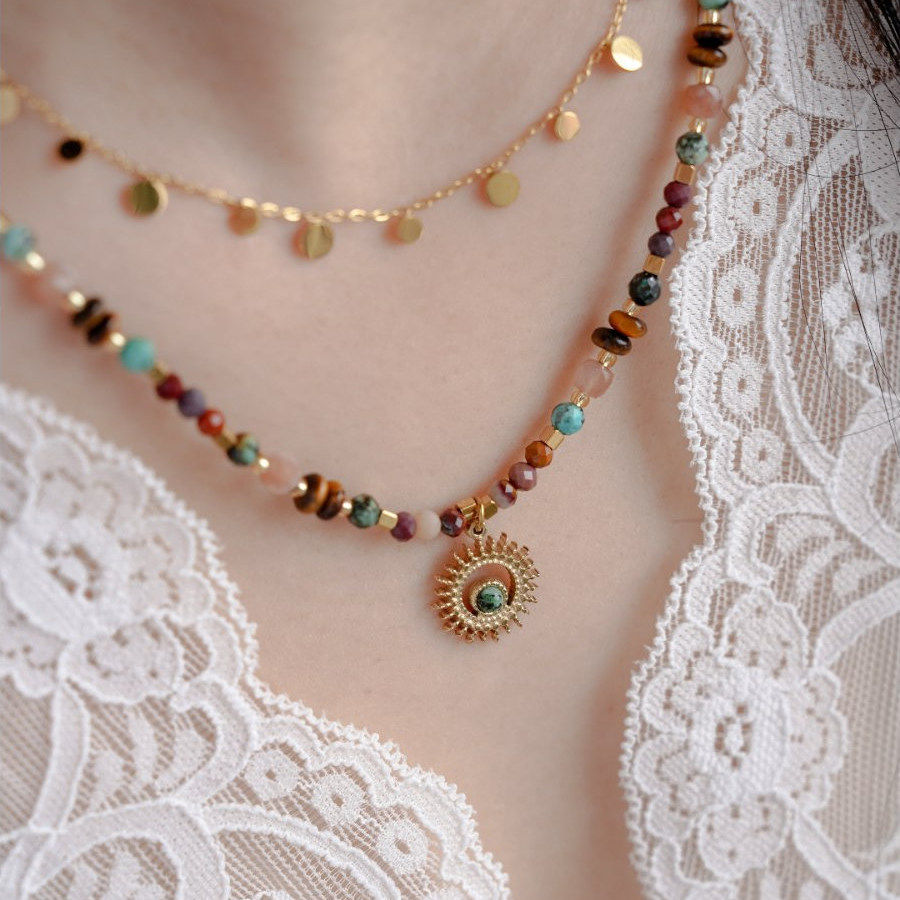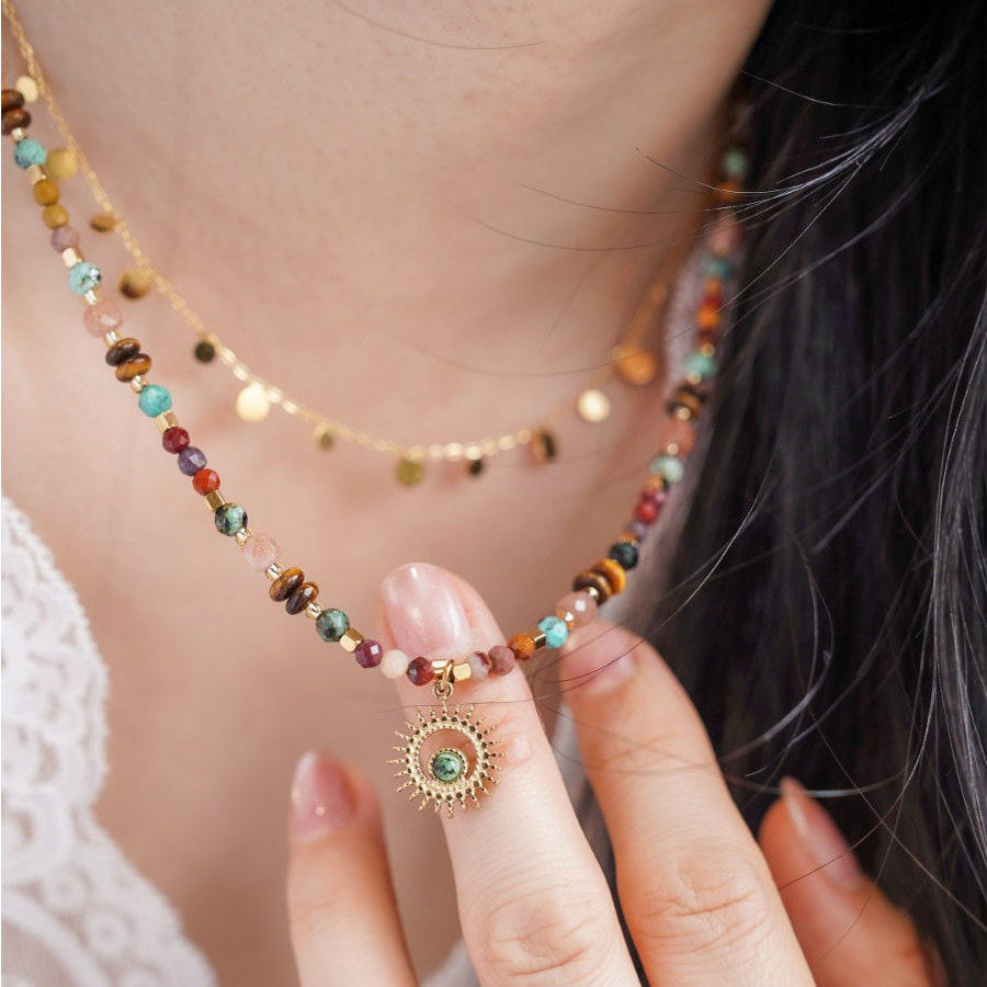 JoJo|法式天然虎眼石图画石粉澳宝松石太阳花吊坠串珠项链锁骨链