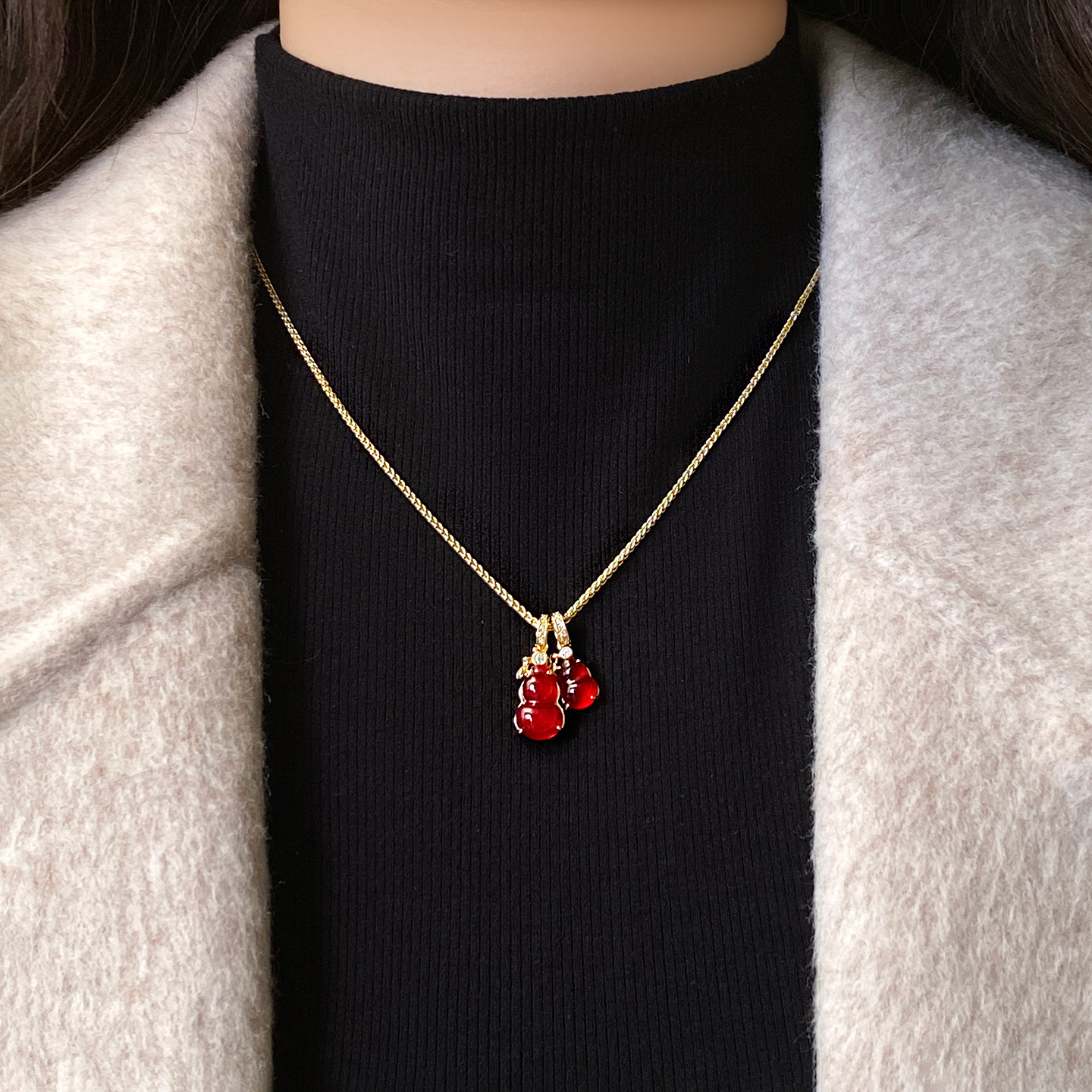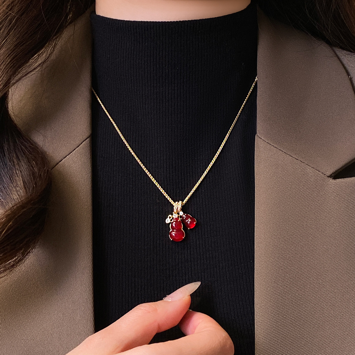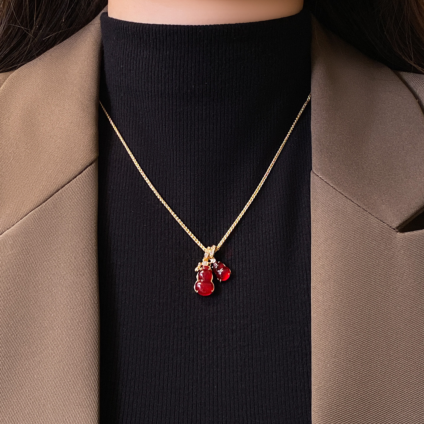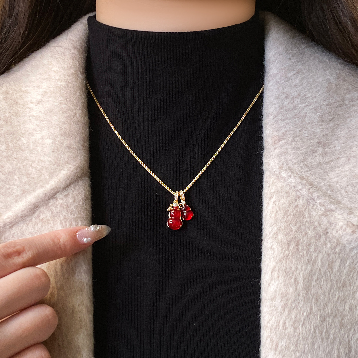 红色双葫芦吊坠项链女高级感轻奢小众配饰2026新款颈链新年毛衣链
