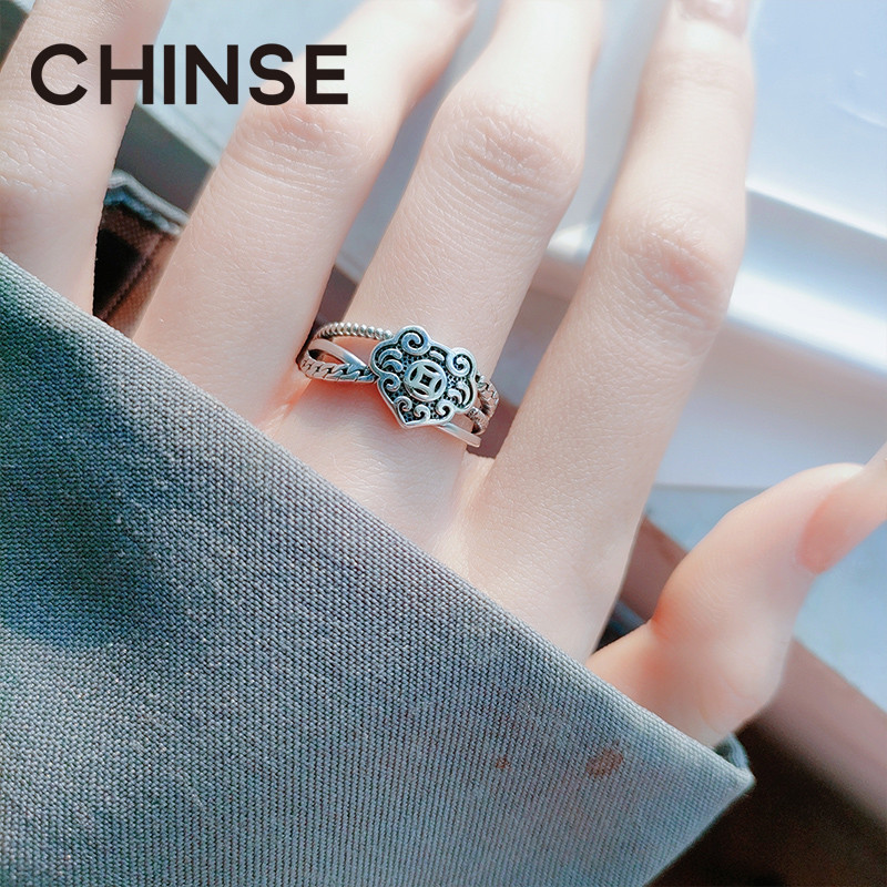 S925纯银吉祥如意戒指复古长命锁国风保平安锁招财钱币指环新款女