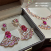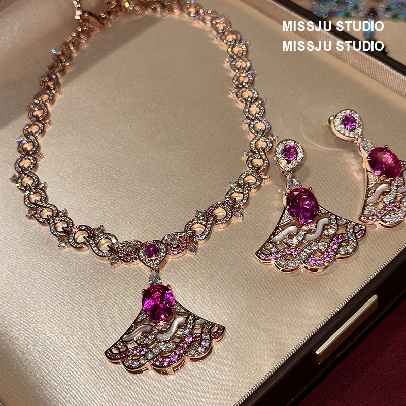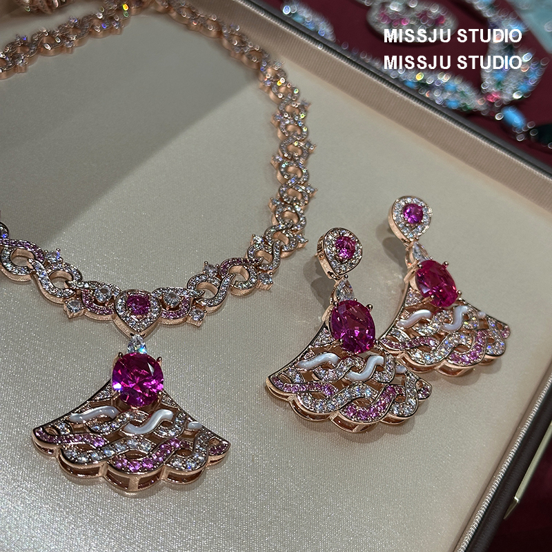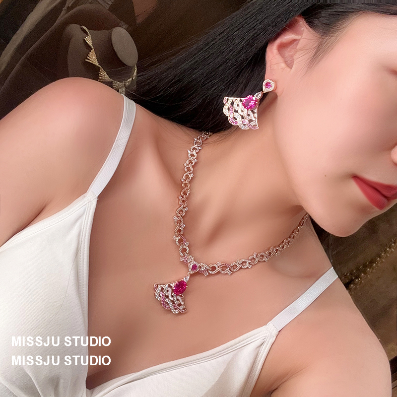 奢华超重工红宝石玫红金扇形扇子白贝母耳环项链女套装锁骨链满钻