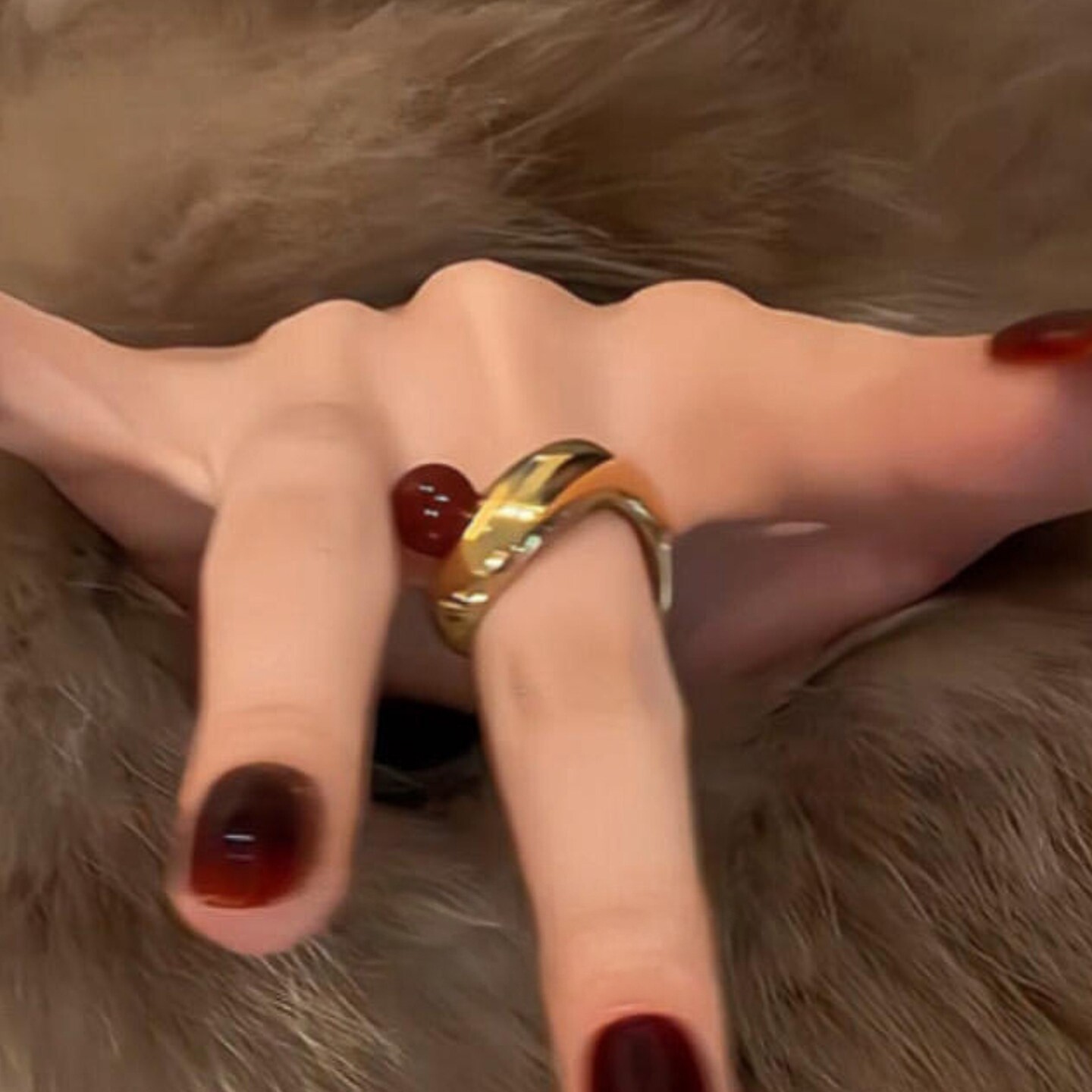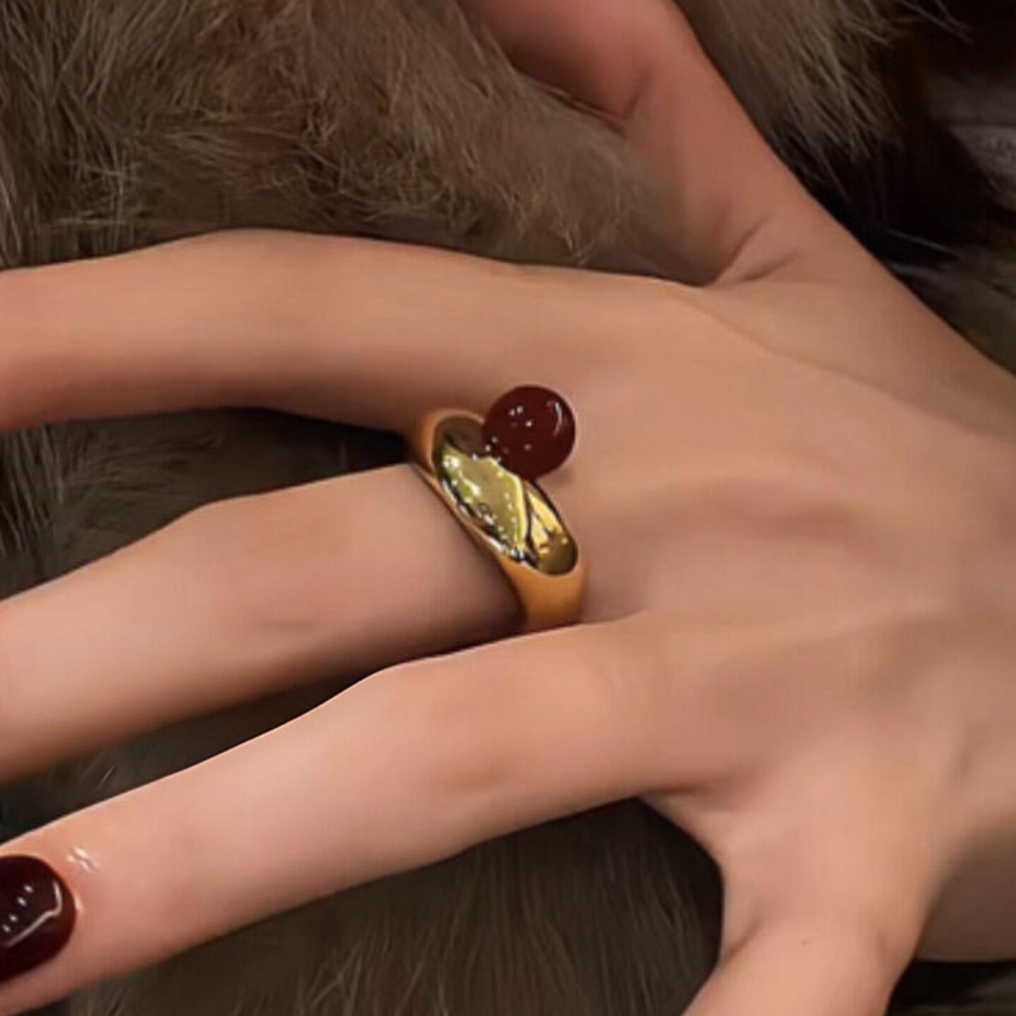 S925纯银红色玛瑙金属几何椭圆金色戒指女士轻奢高级感复古食指戒