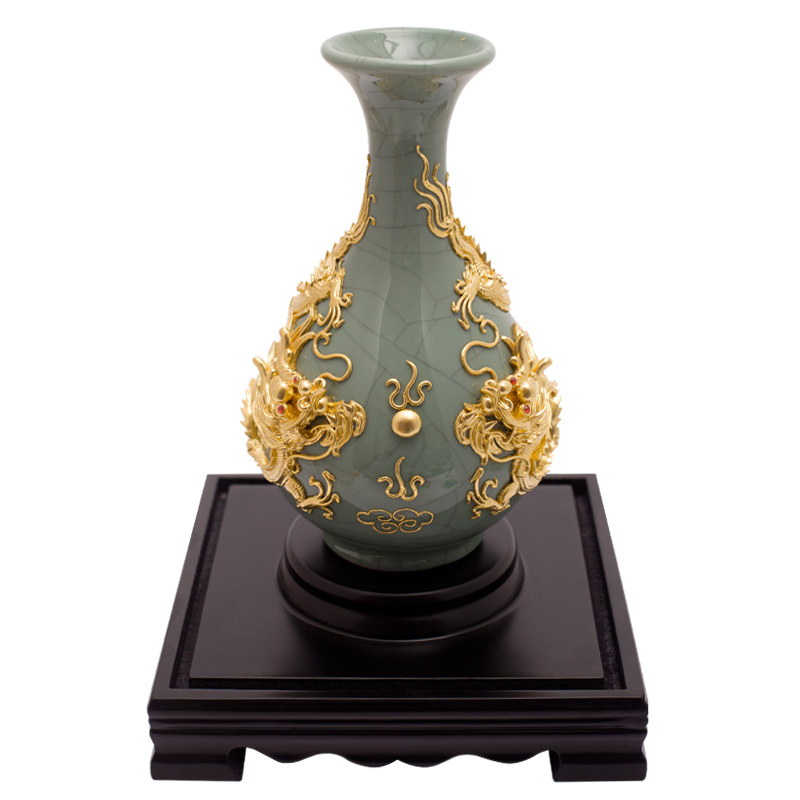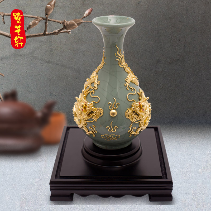 双龙玉壶春哥窑瓶 漆线雕花瓶新中式家居陶瓷工艺品摆件厦门特产