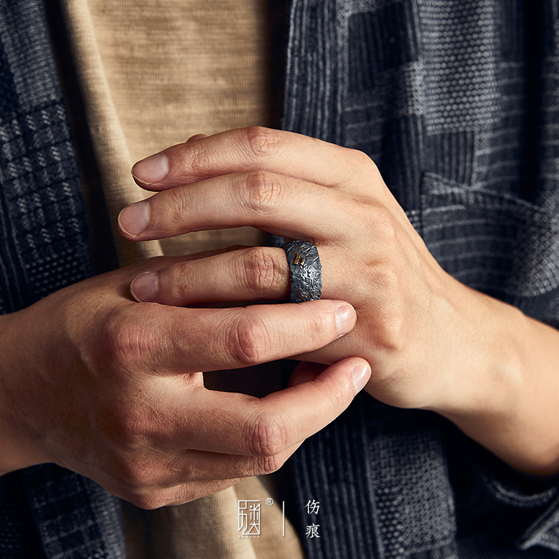 手工原创【伤痕】戒指男士个性复古小众设计食指环纯银手工中指戒