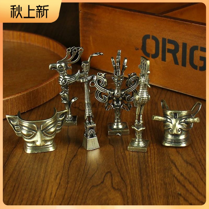 一套全黄铜三星堆文创摆件纯铜大立人纵目面具太阳神鸟旅游纪念品