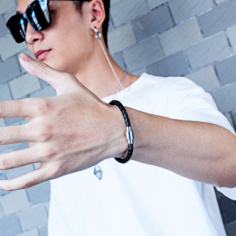 黑色皮绳手链男青少年日韩版时尚牛皮编织手绳手环跨境朋克风饰品