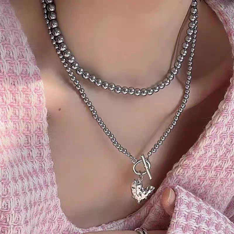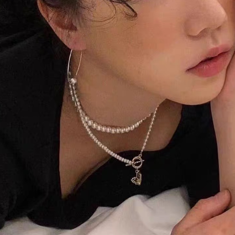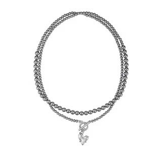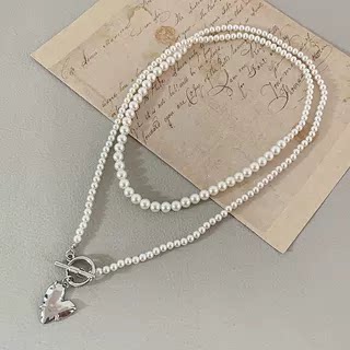 新款ins风双层珍珠项链爱心渐变灰色珍珠长款项链锁骨链