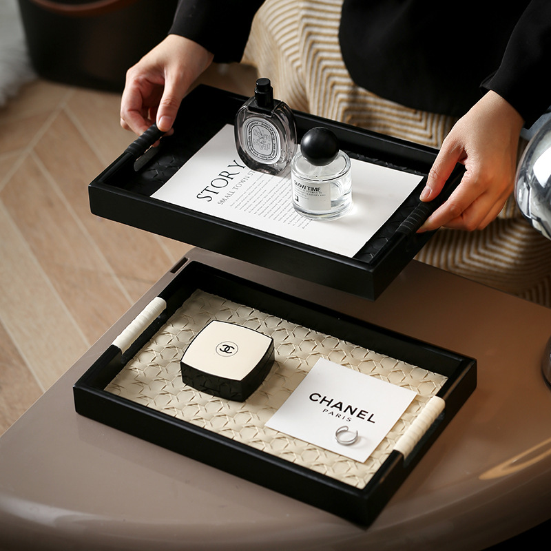 北欧风轻奢黑色皮质香薰木托盘感置物收纳盘客厅卧室装饰摆件
