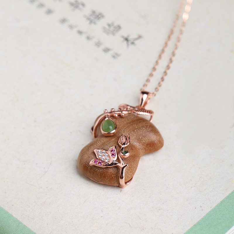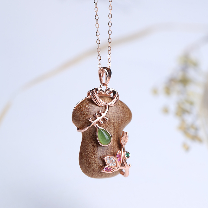 印度老山檀木旗袍式吊坠手工纯银缠绕镶边925银女士文雅气质项链
