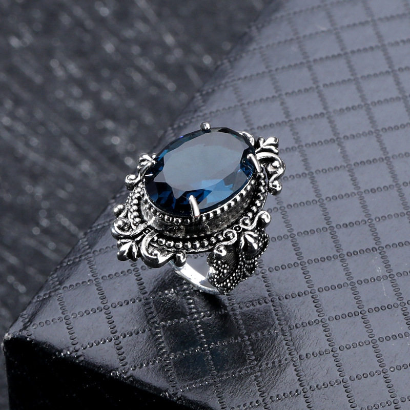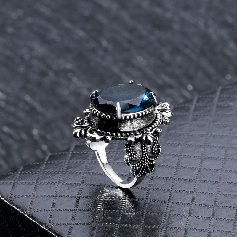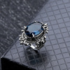 Young新款合成海蓝色托帕石戒指欧美复古镀925银鹅蛋形指环男女款