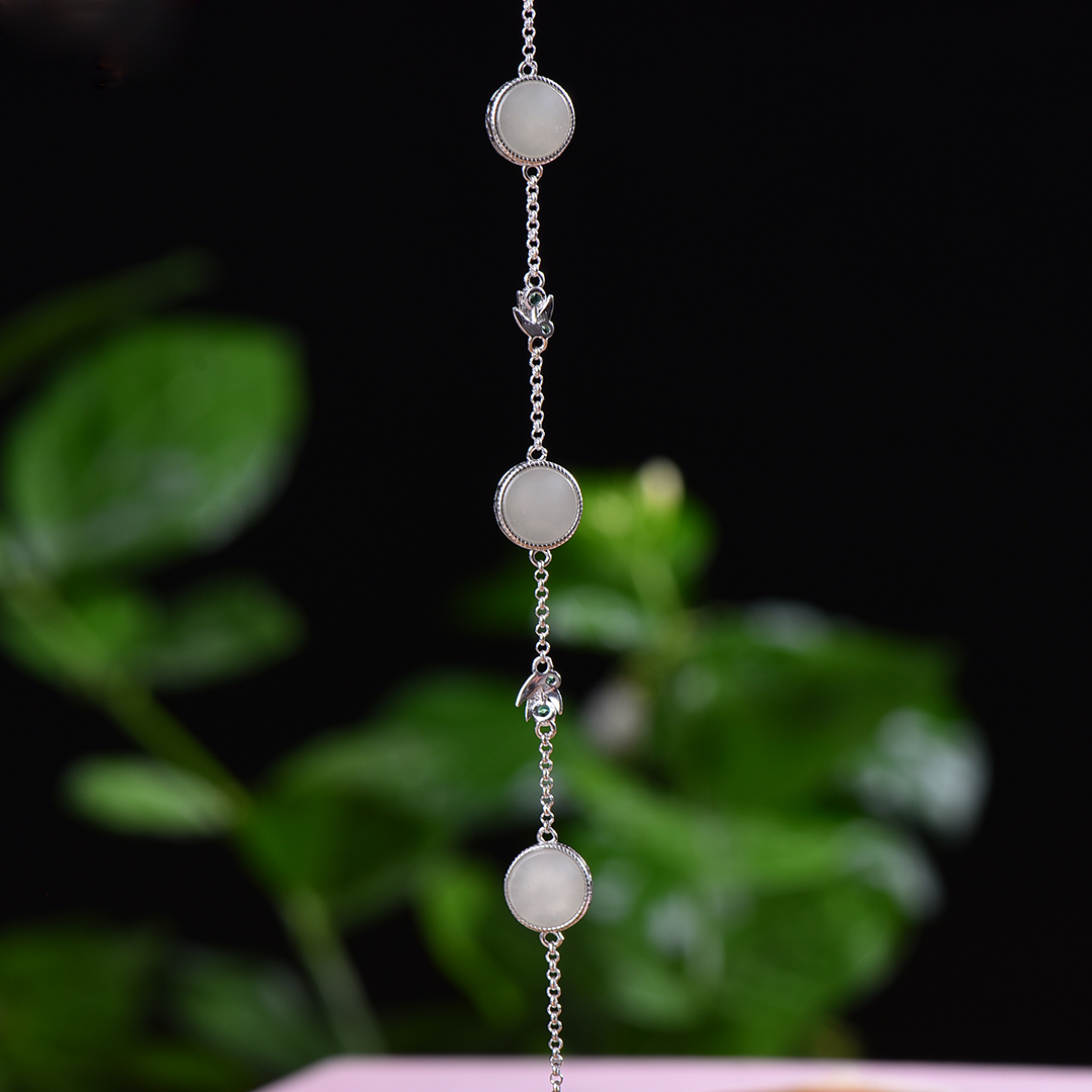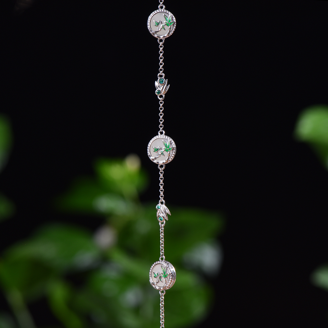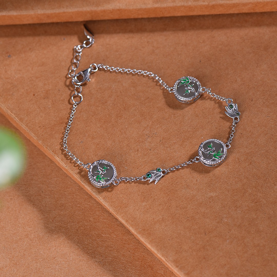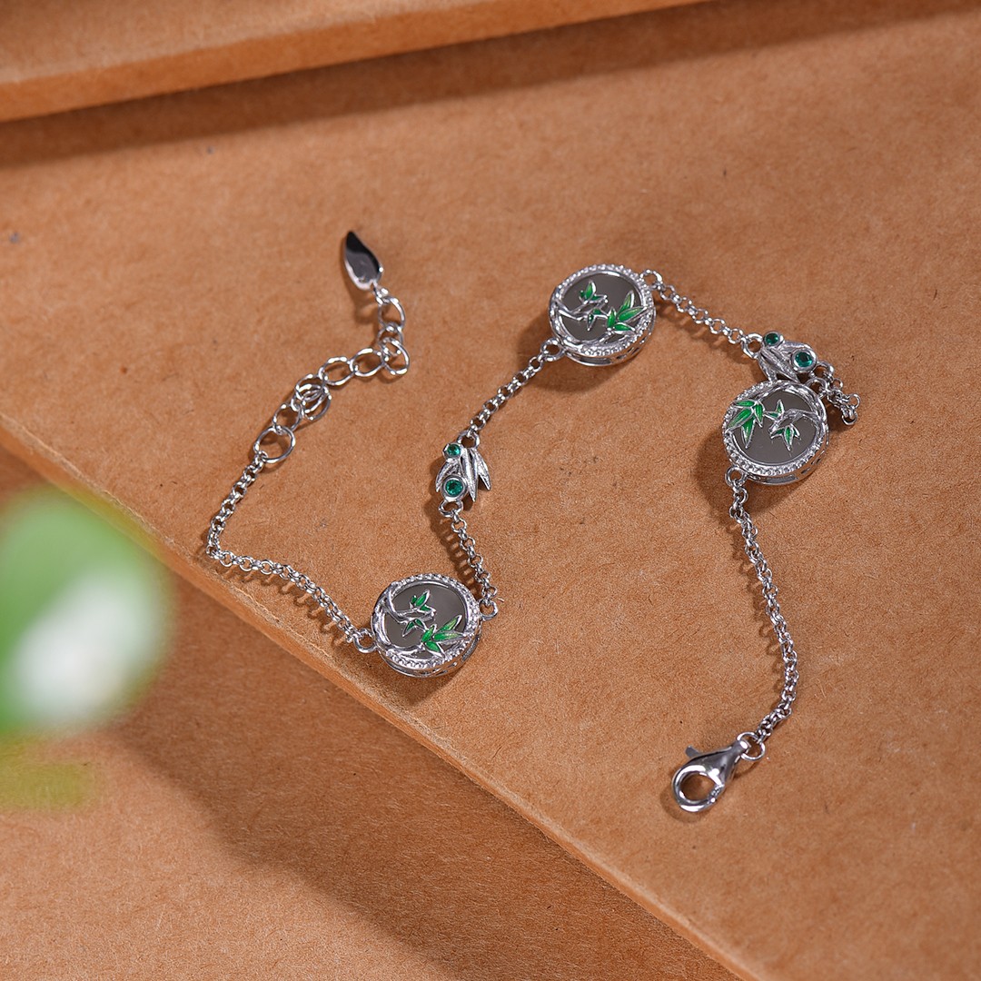 S925银镶嵌和田玉圆平面珐琅竹节手链