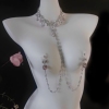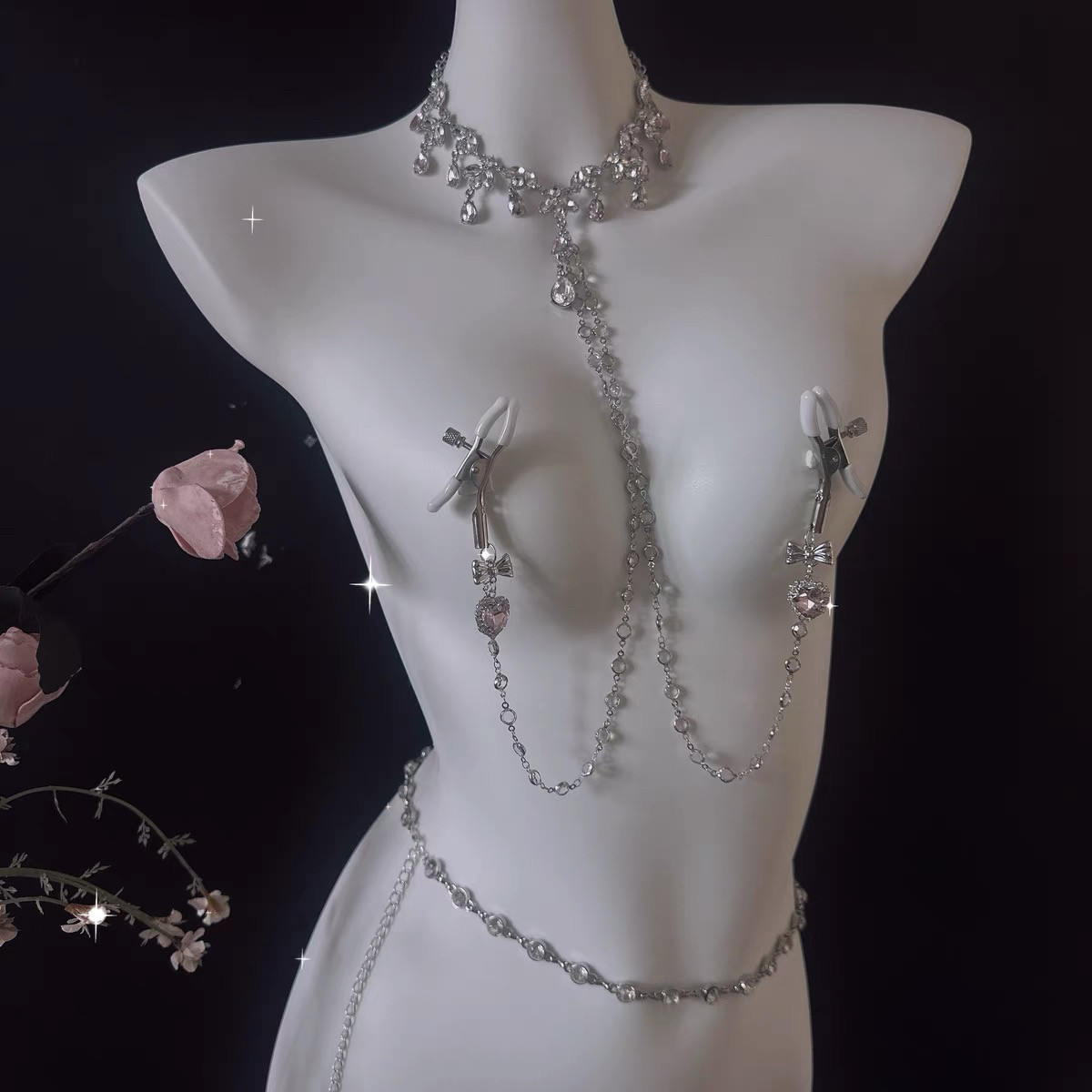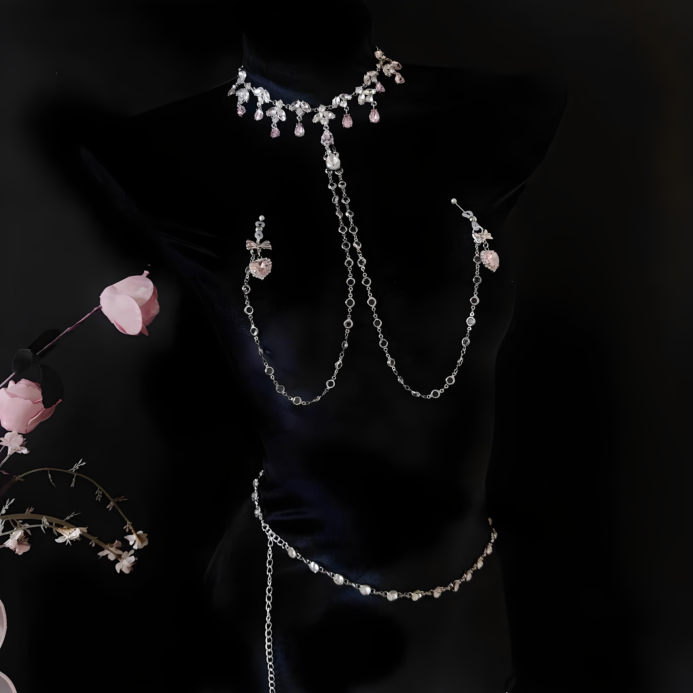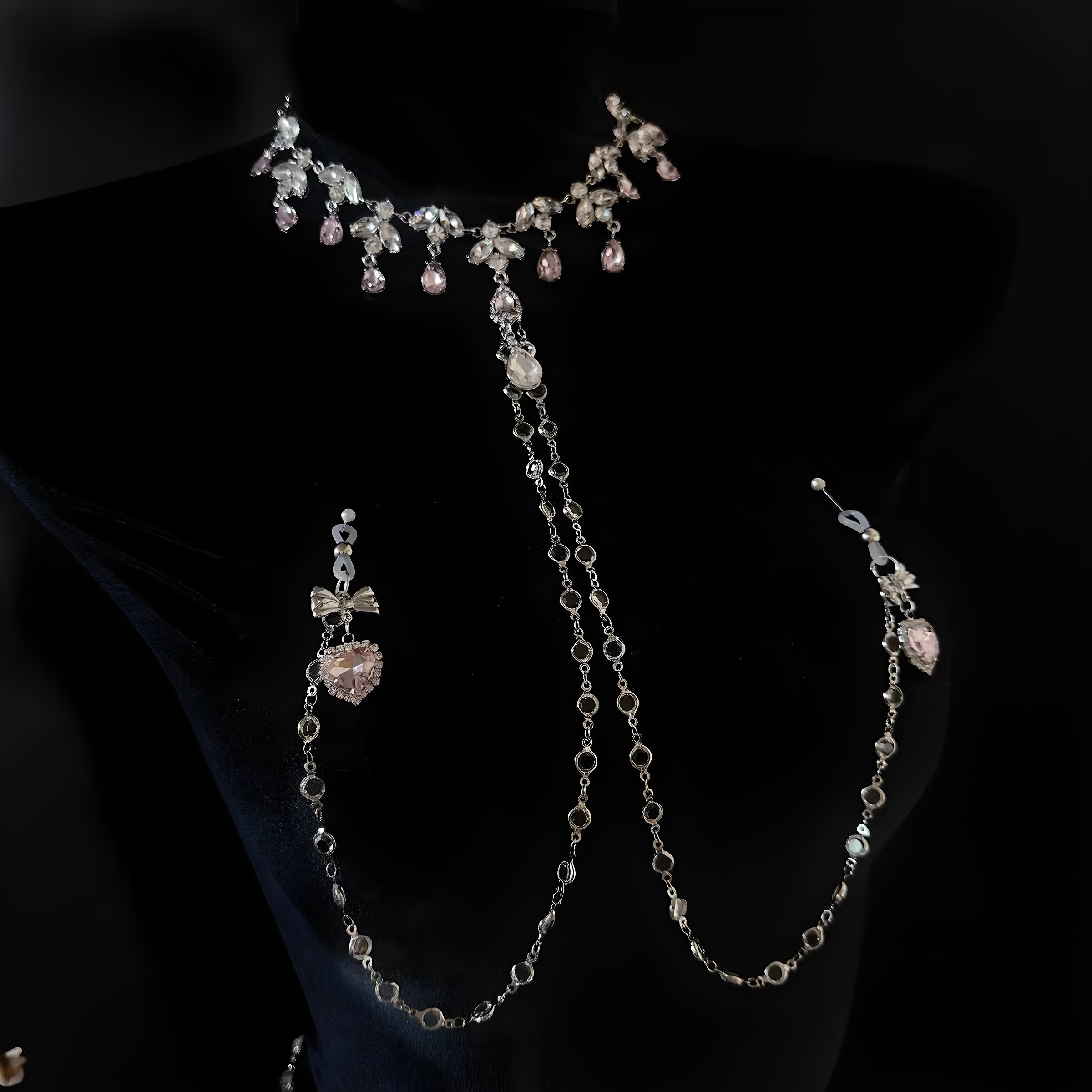 灼欲*重工设计身体链草莓夹粉钻爱心项链性感连体钻腰链穿戴饰品