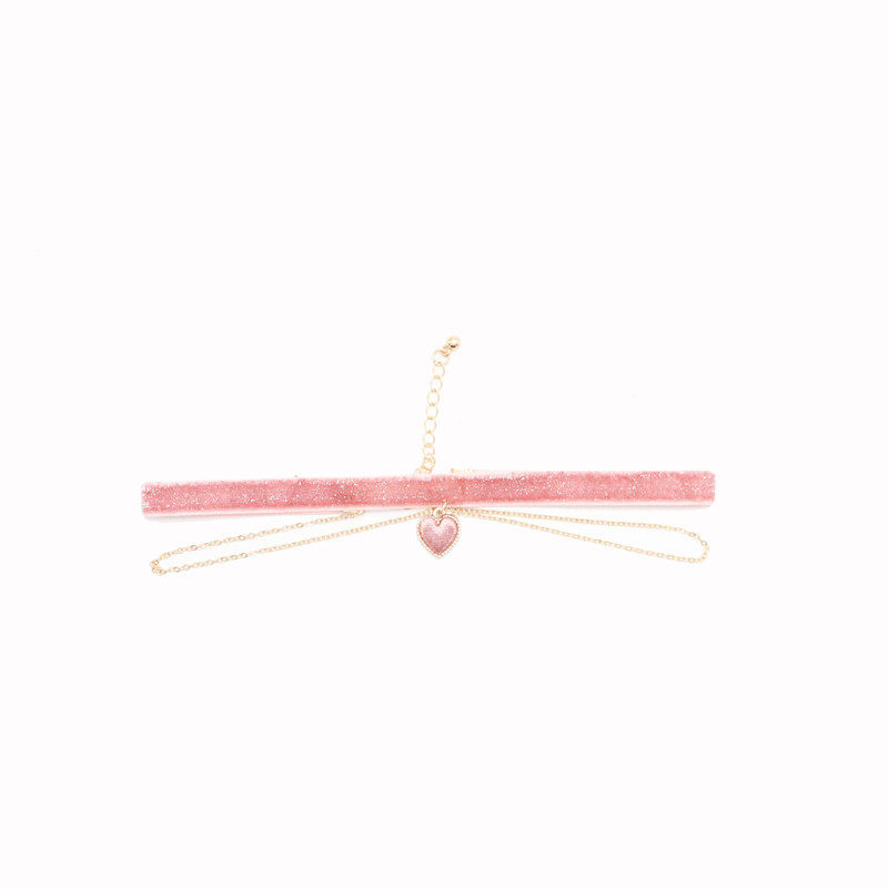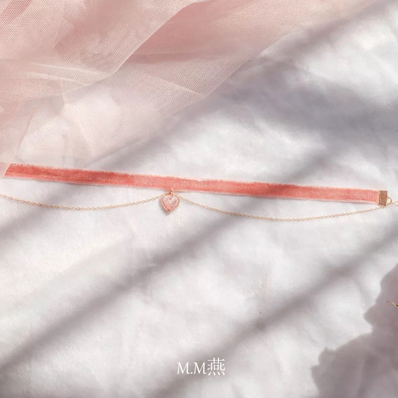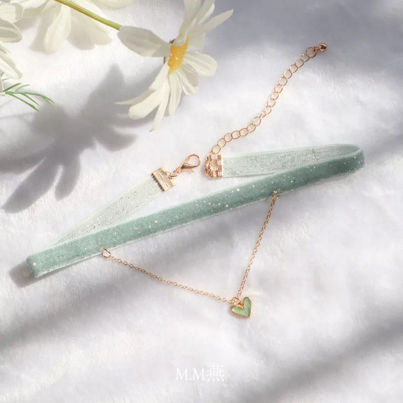 日韩超仙小清新彩色超闪亮丝绒气质仙女粉色绿色爱心吊坠项链颈链