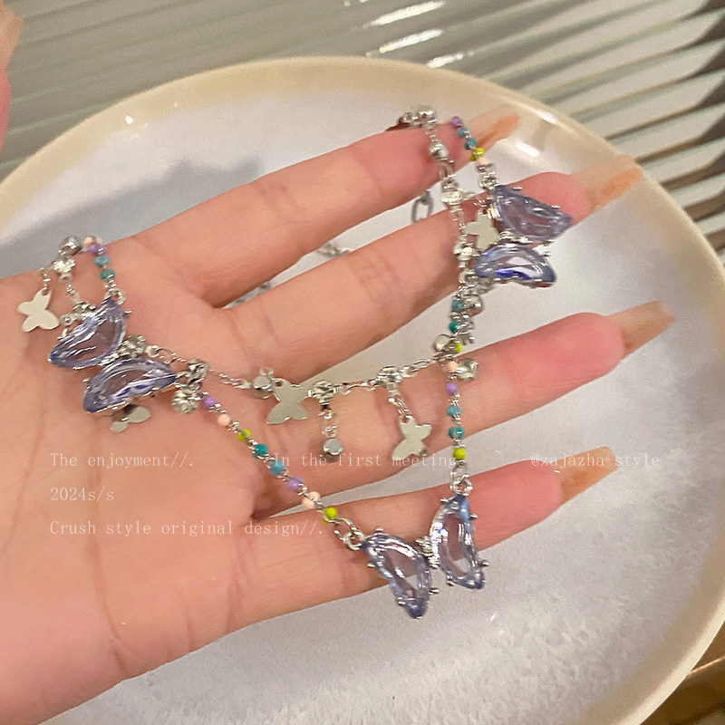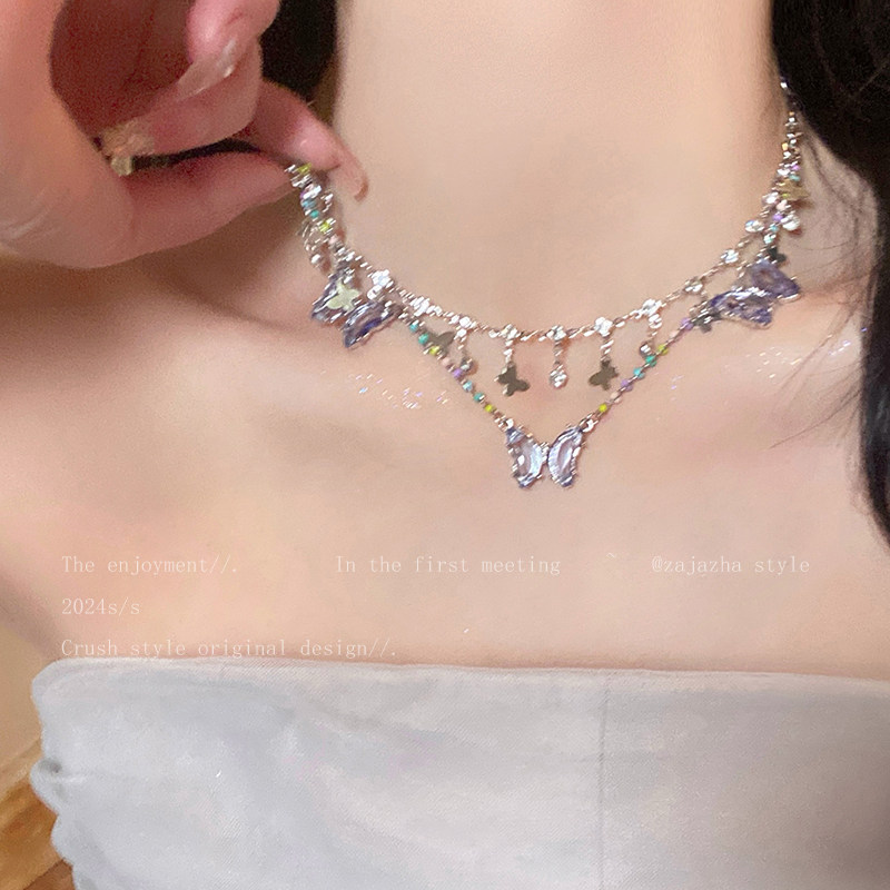 水晶紫色蝴蝶项链女款海边叠戴锁骨链配饰轻奢小众高级感装饰颈链