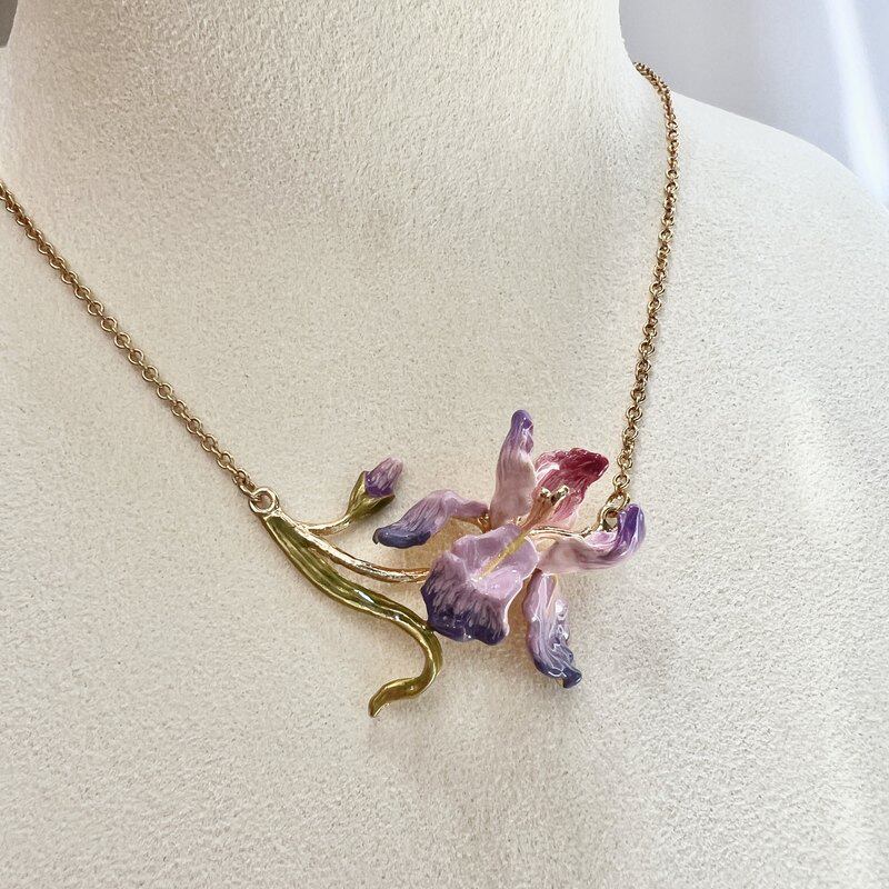 原创设计粉紫色鸢尾花珐琅项链锁骨链精致高雅送女友手绘清新浪漫