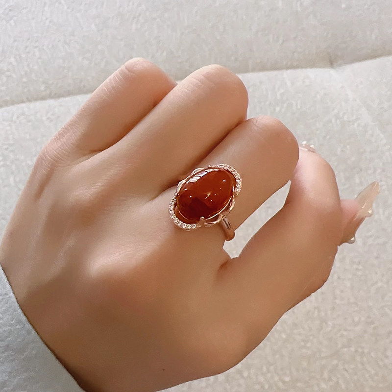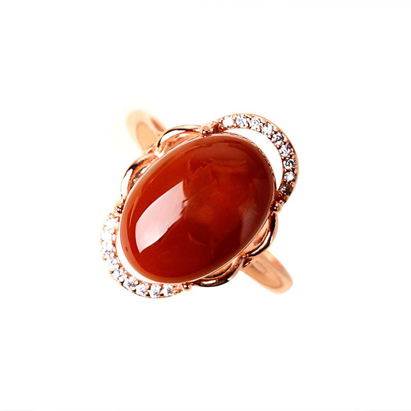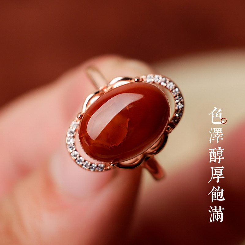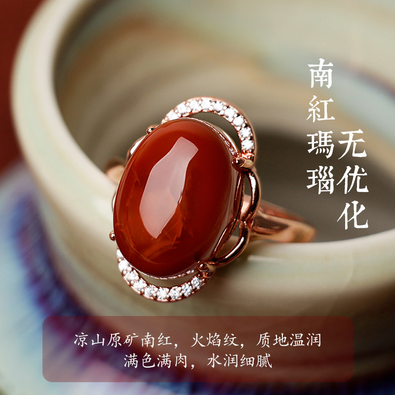 红红火火凉山天然南红玛瑙戒指女满肉柿子红火焰纹玫瑰金S925银戒