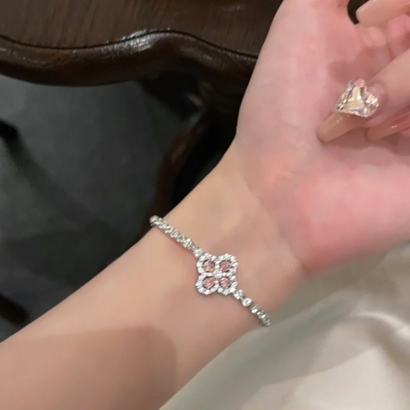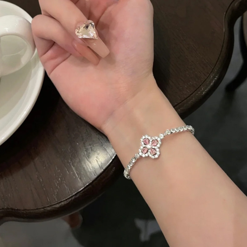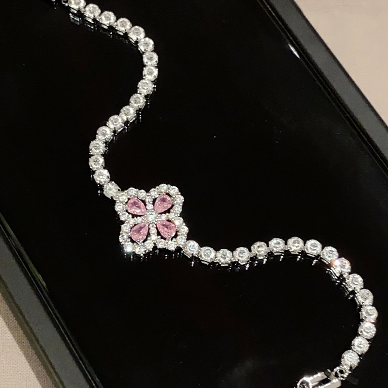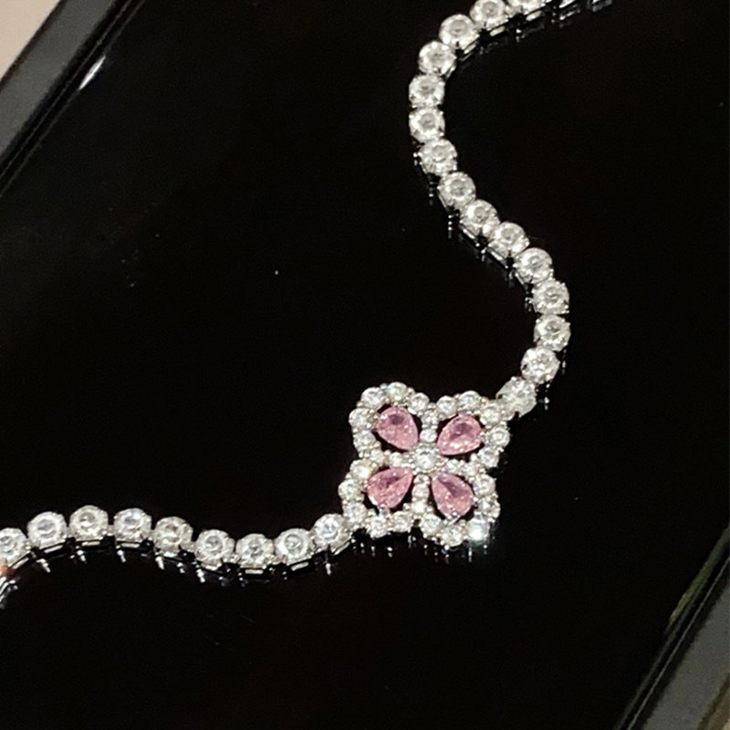 精致轻奢质感小众粉色镶钻四叶草吊坠小巧耳钉甜美满钻手链饰品女