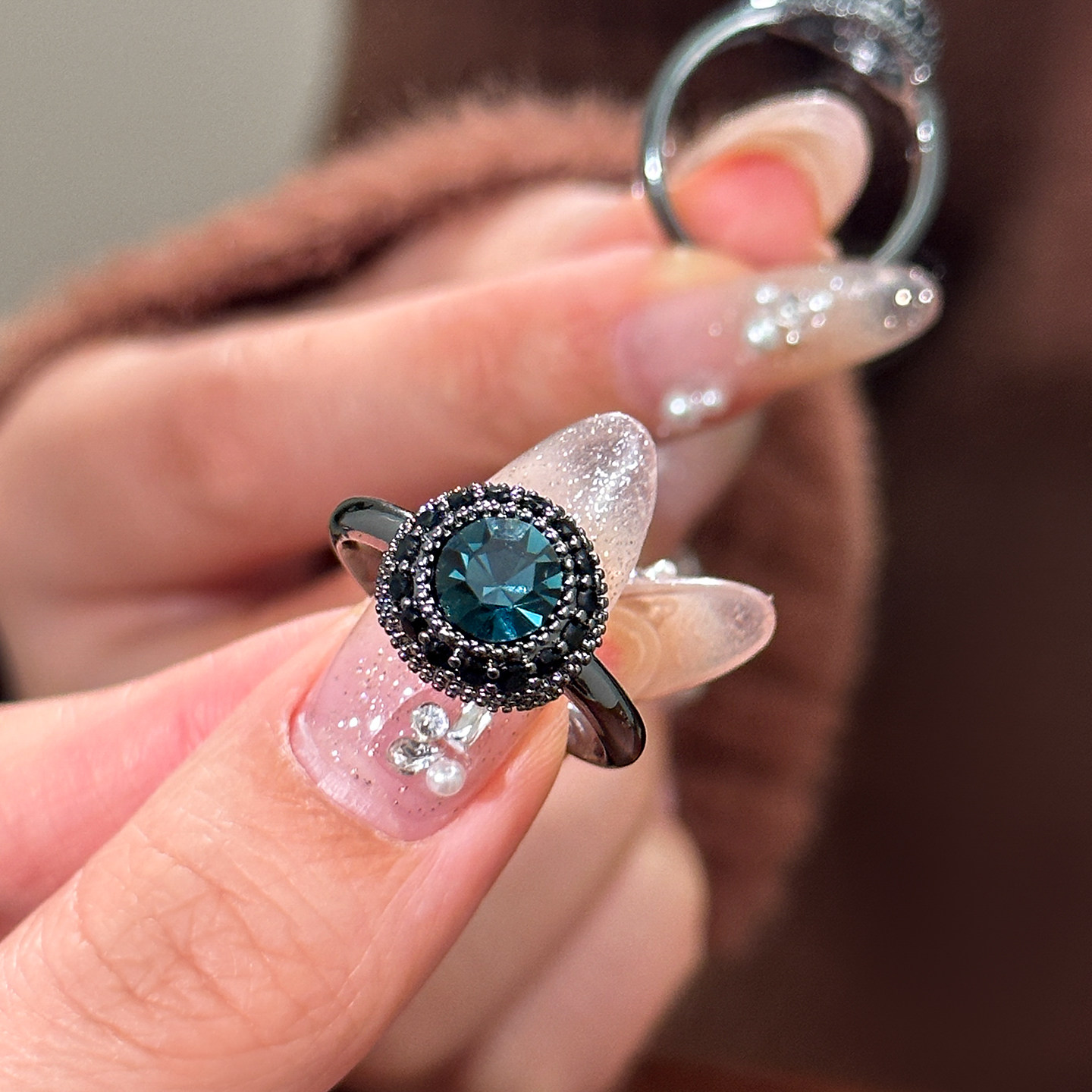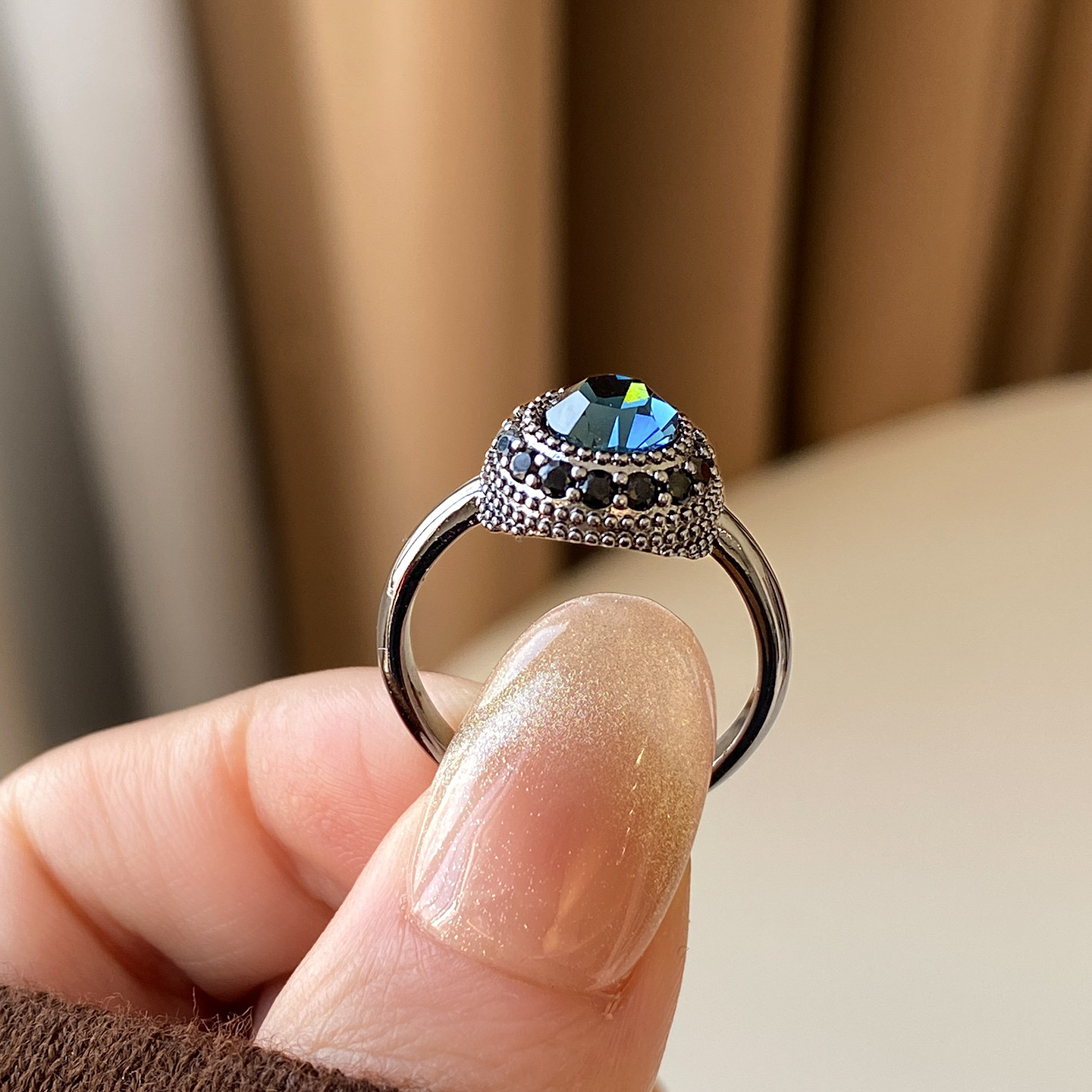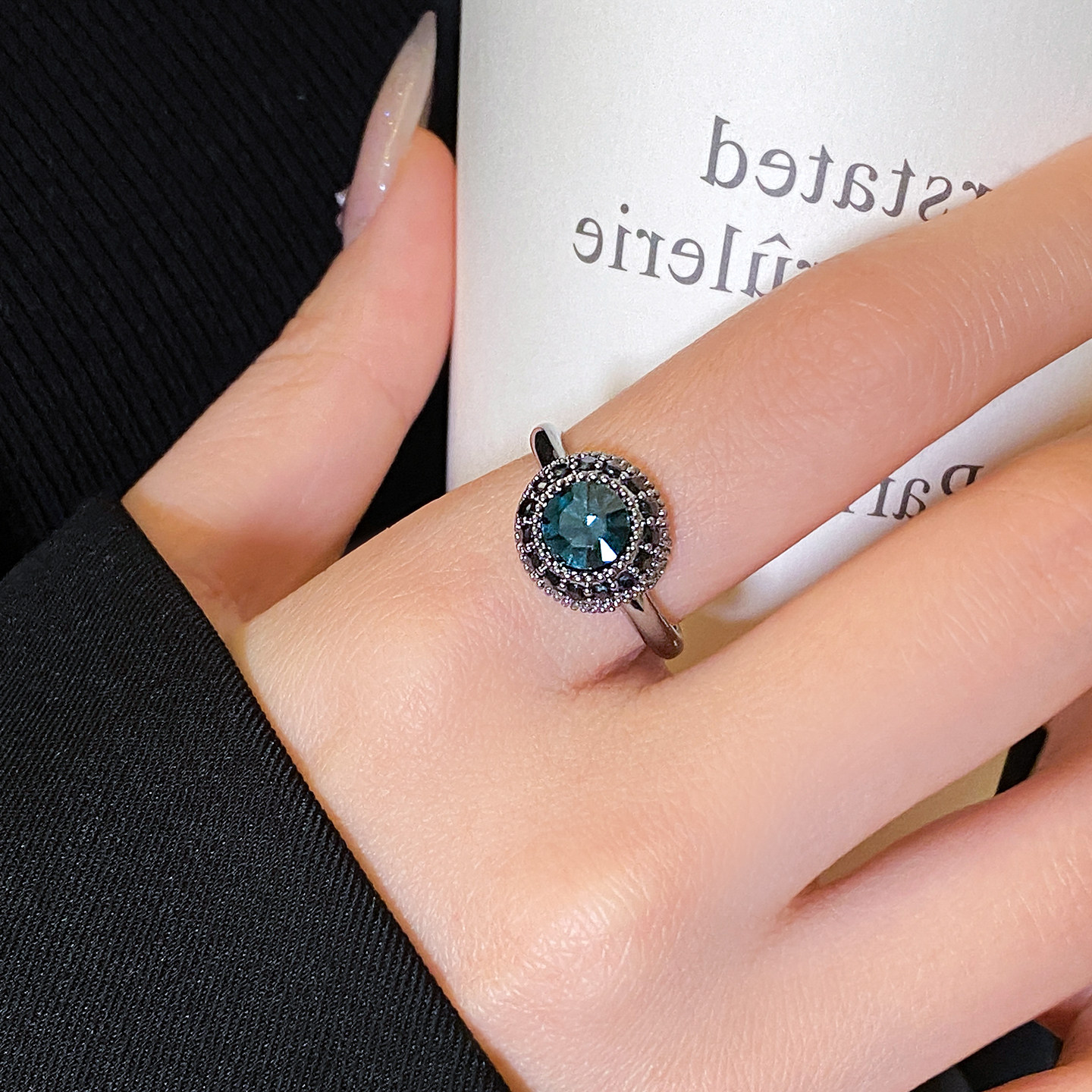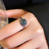 复古蓝色圆形水晶戒指女小众设计开口食指指环巨好看的轻奢高级感