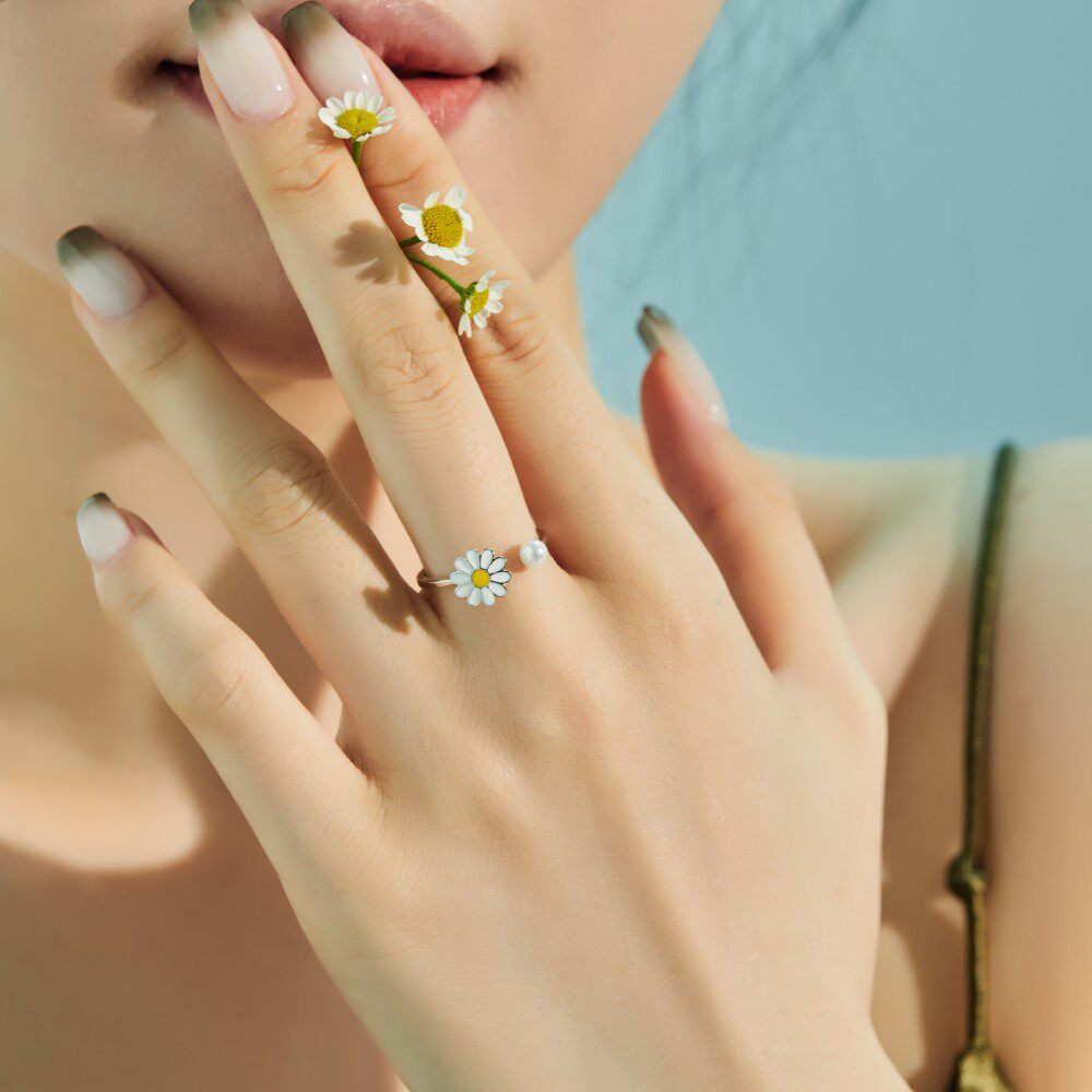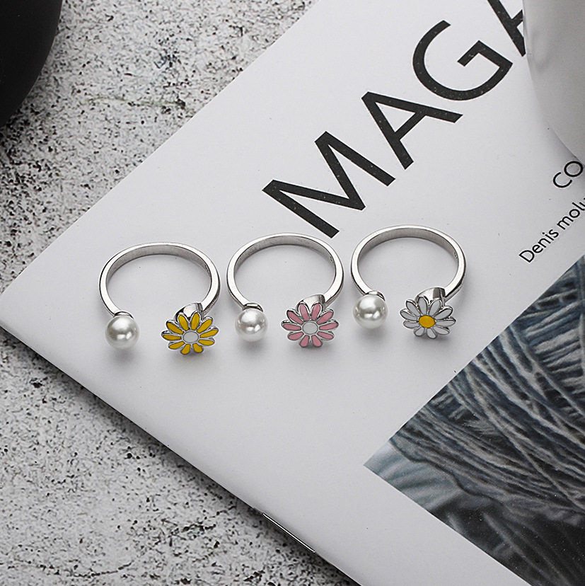 跨境爆款雏菊开口旋转戒指女简约森系小清新珍珠花朵转动解压指环