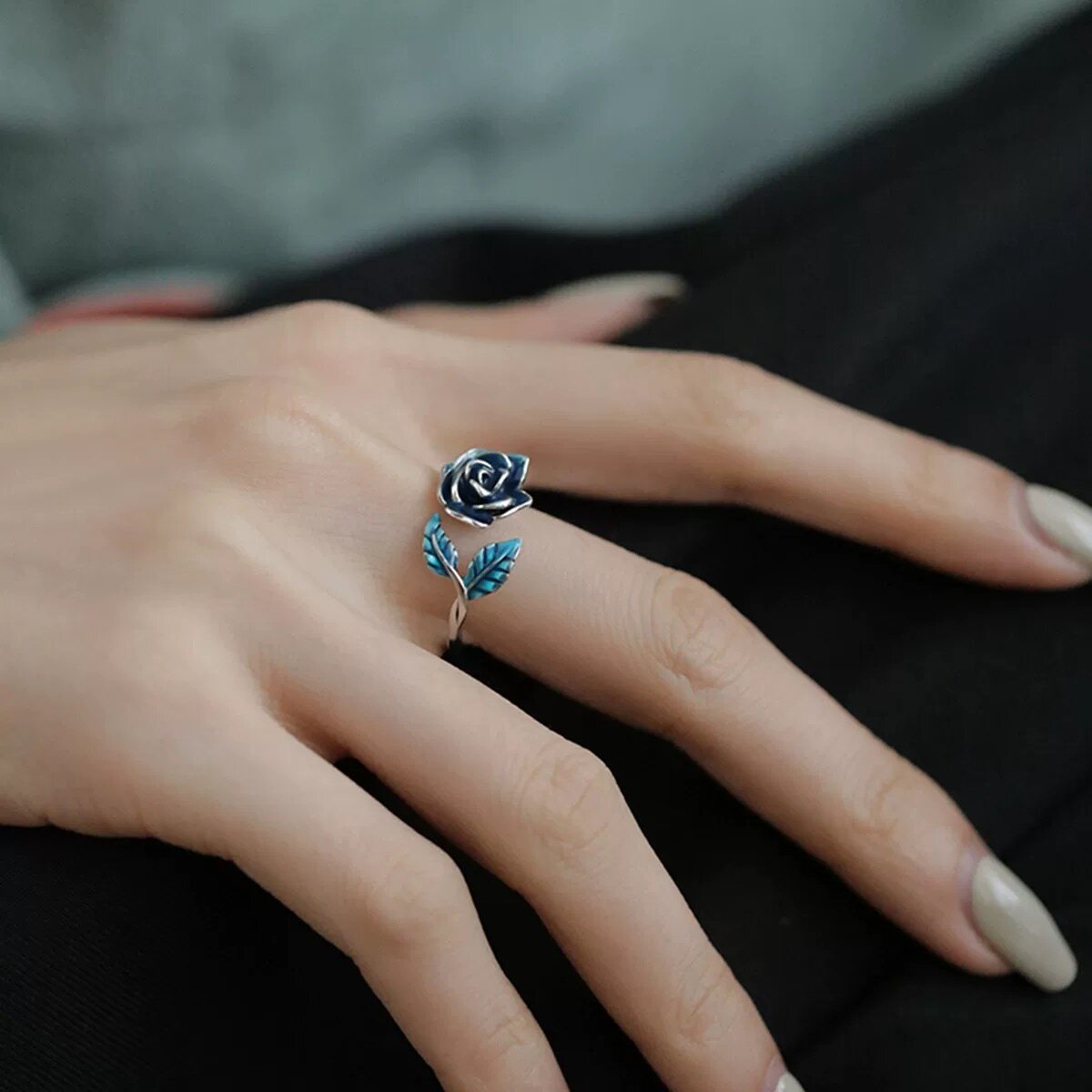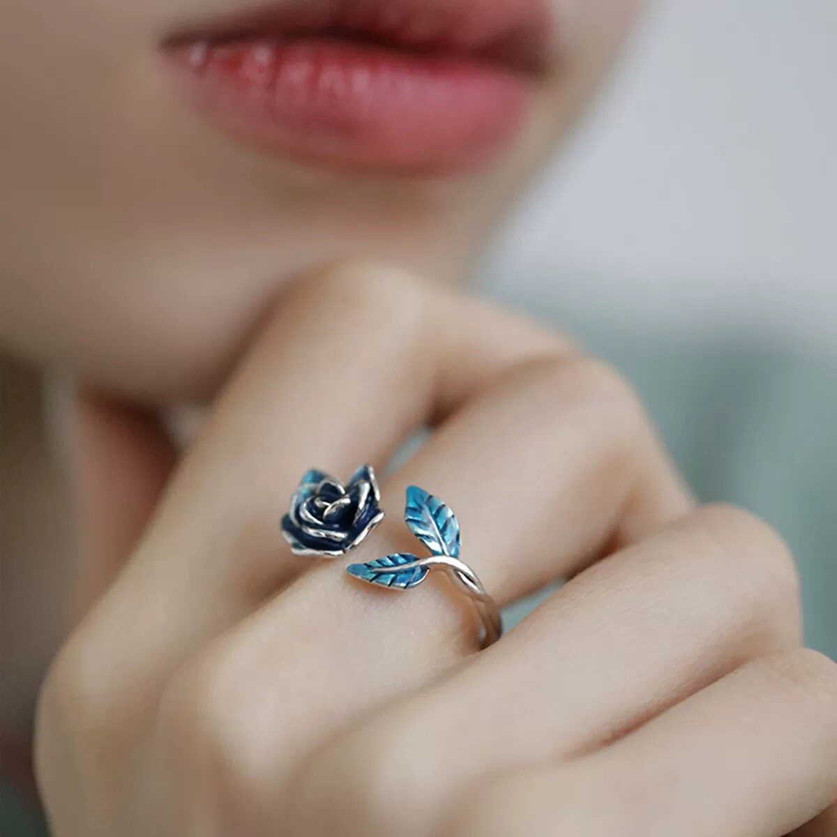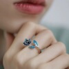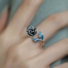 925银蓝玫瑰花叶子珐琅彩戒指民族风女小众新中式复古个性开口戒