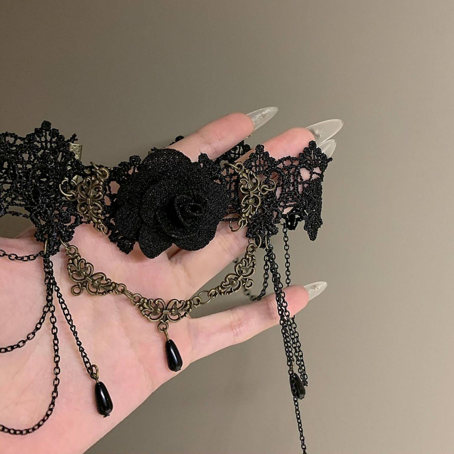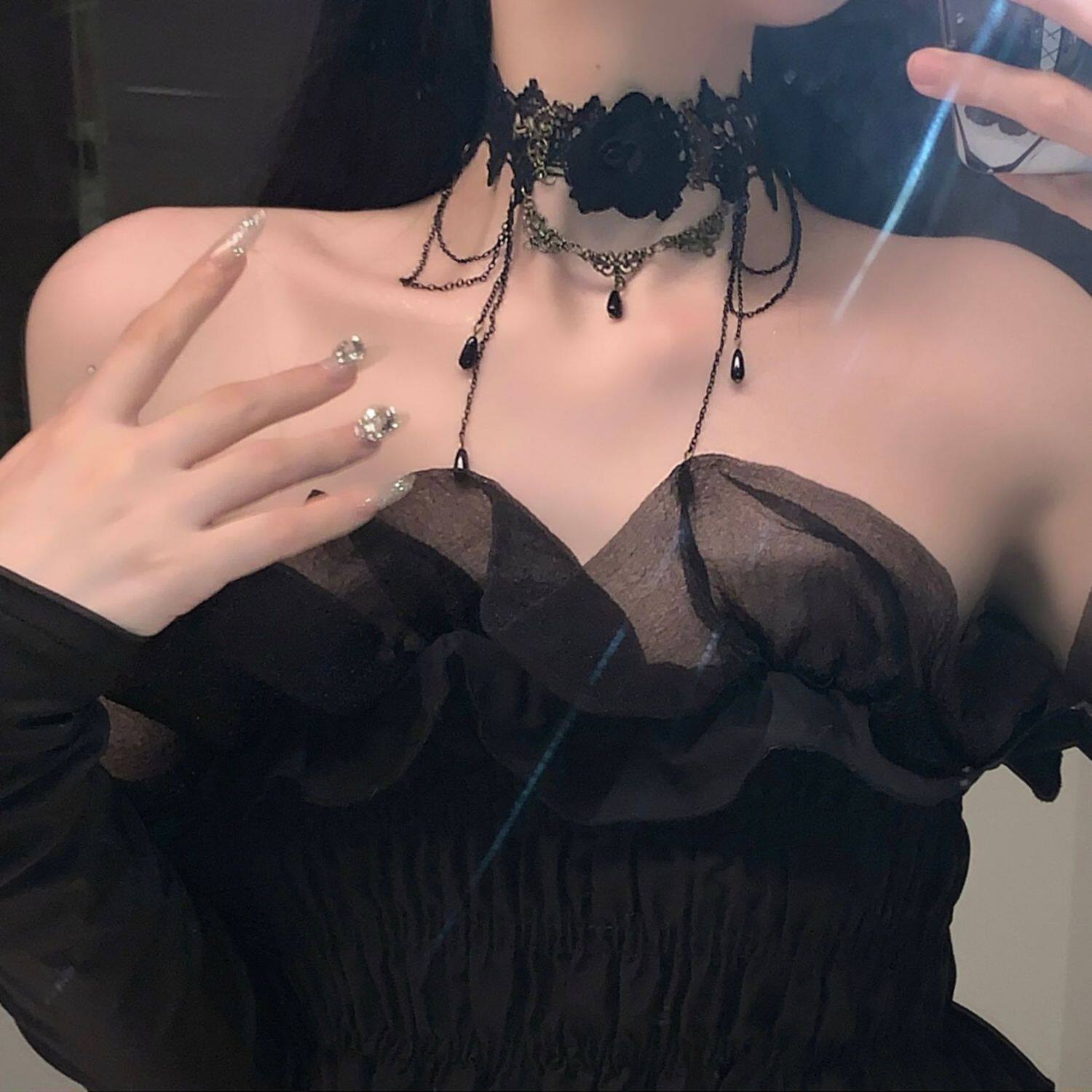 黑色蕾丝脖子配饰装饰项链女项圈流苏吊坠玫瑰花颈带choker暗黑系