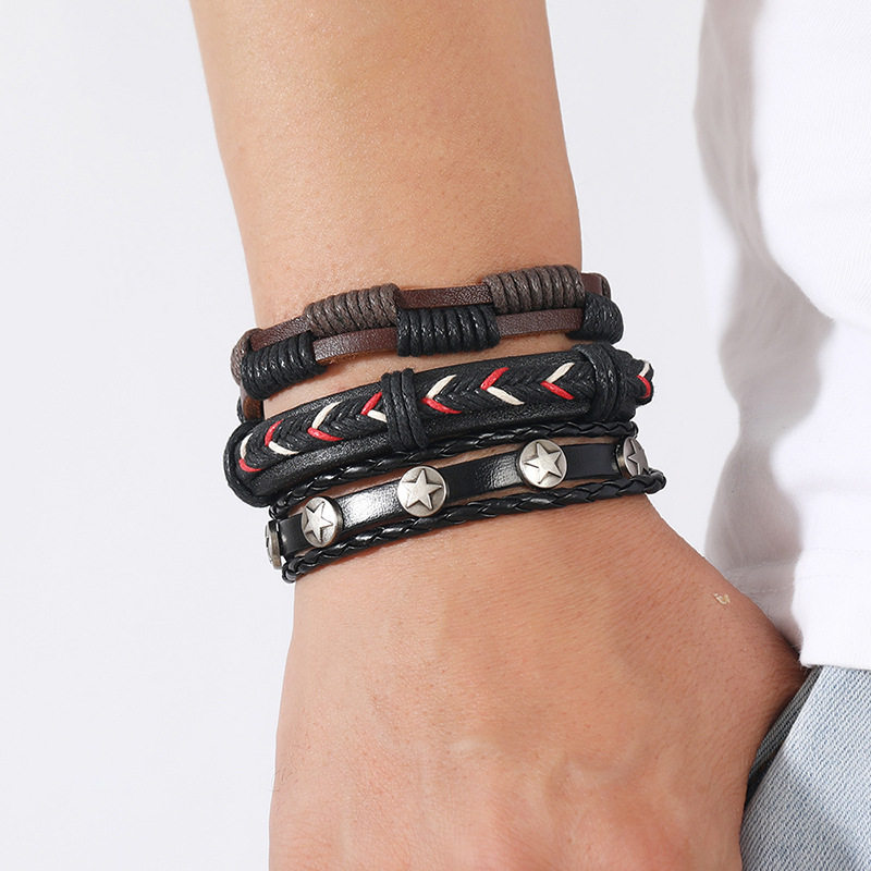 欧美跨境电商货源diy牛皮手链复古合金树叶五角星编织套装手链