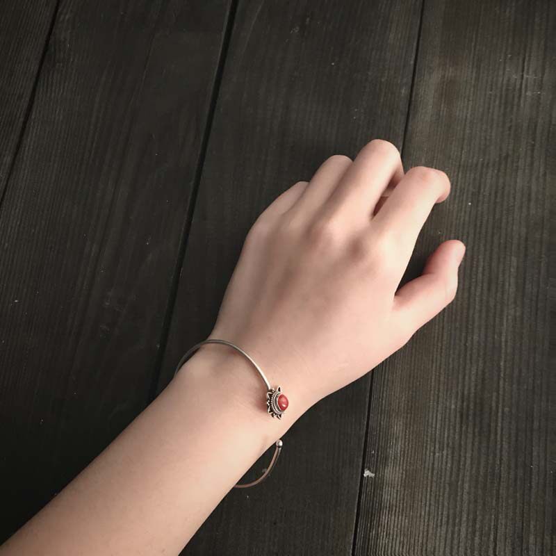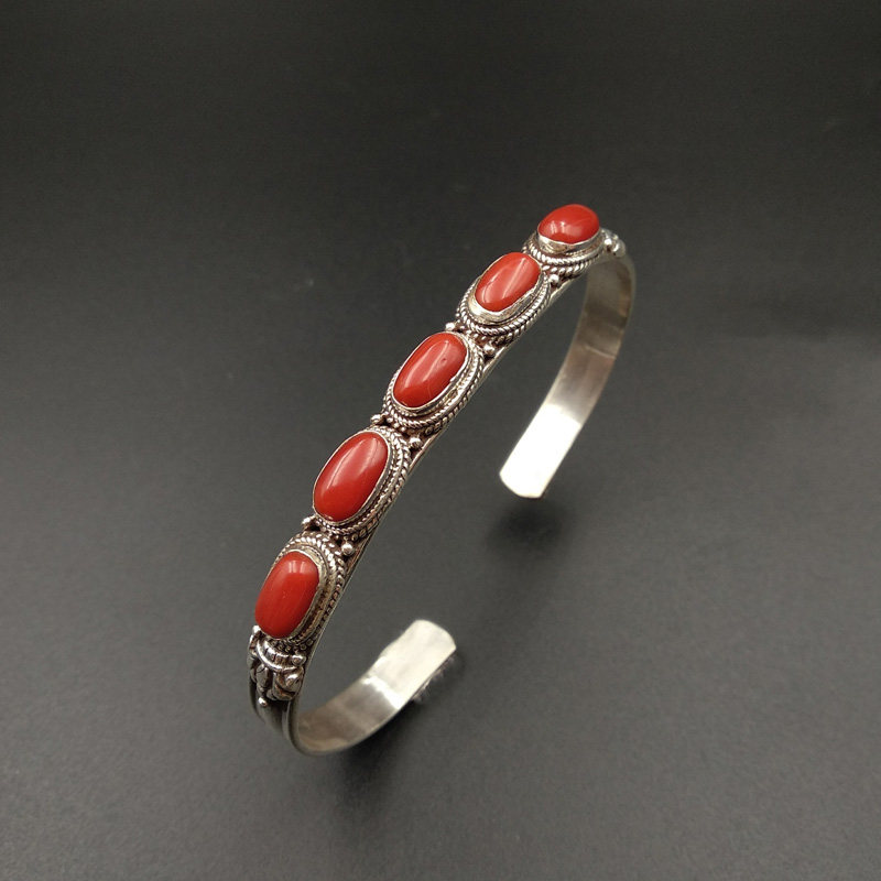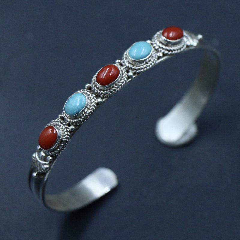 尼泊尔手工饰品银红色宝石手镯开口手环复古创意个性藏式民族风