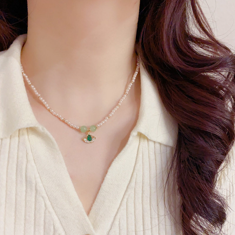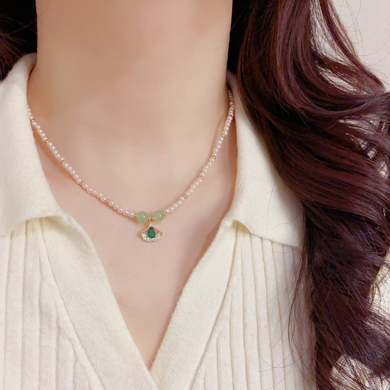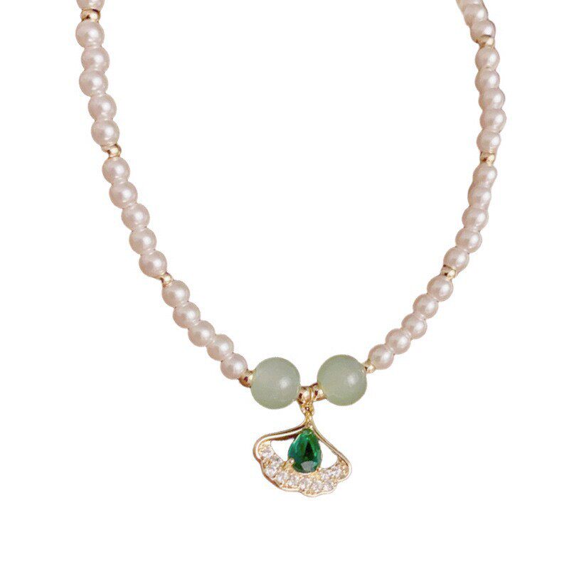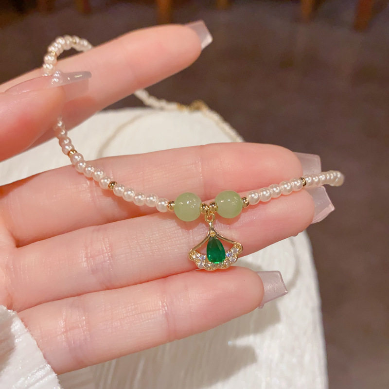 日韩时尚简约设计感绿色银杏叶吊坠珍珠项链个性轻奢温柔百搭颈链