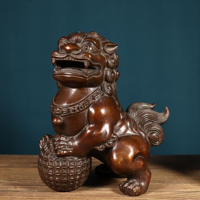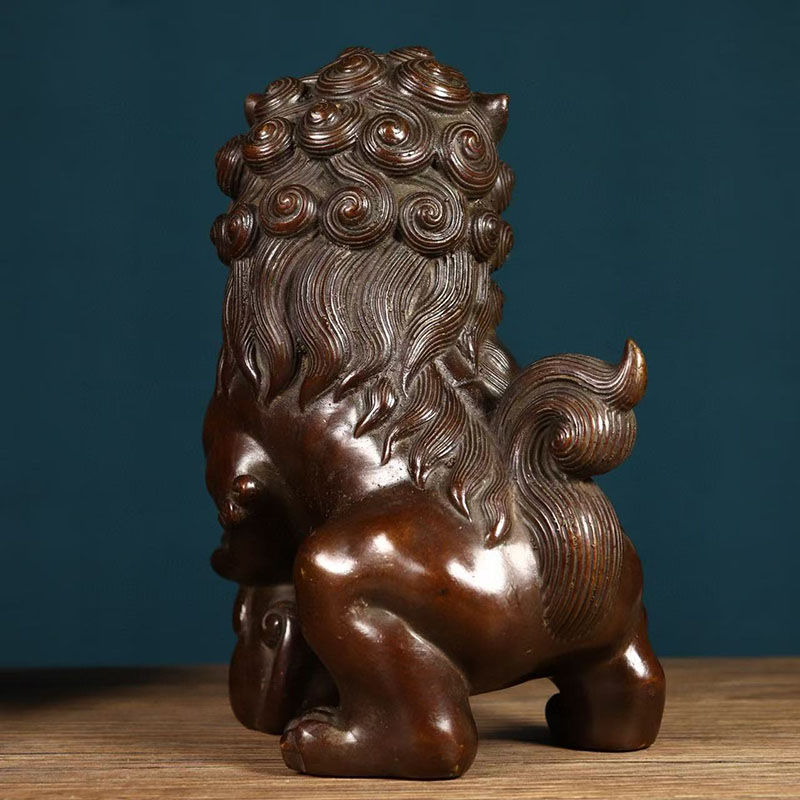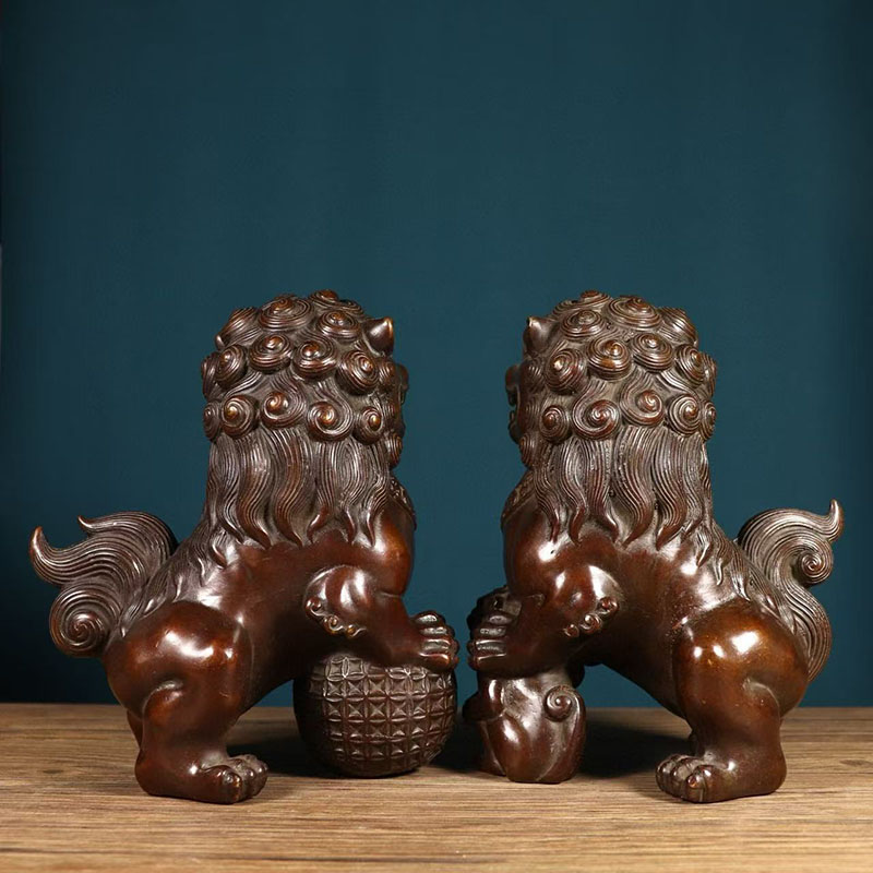 古董文玩纯铜紫铜狮子滚绣球一对桌面办公室摆件北京狮复古铜狮