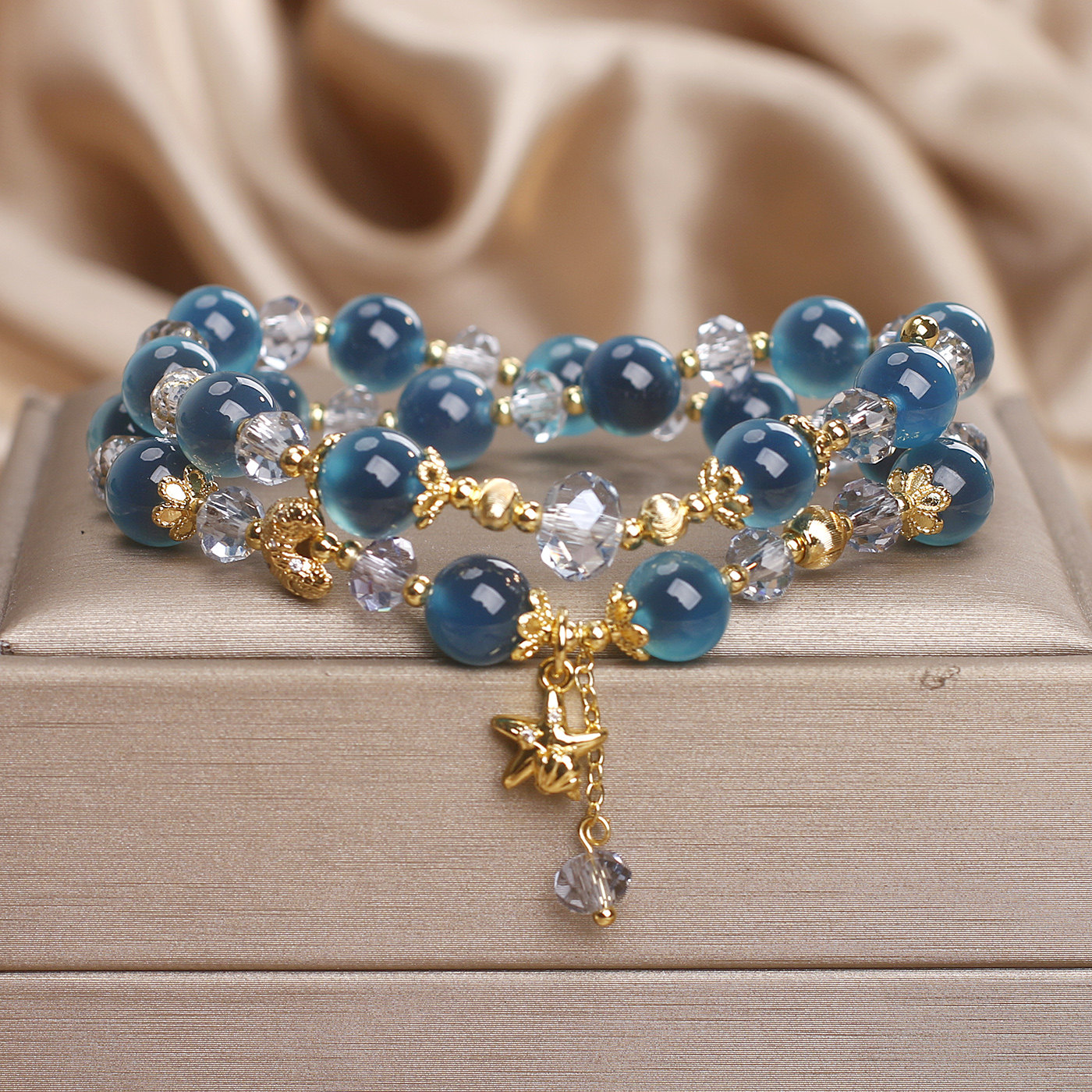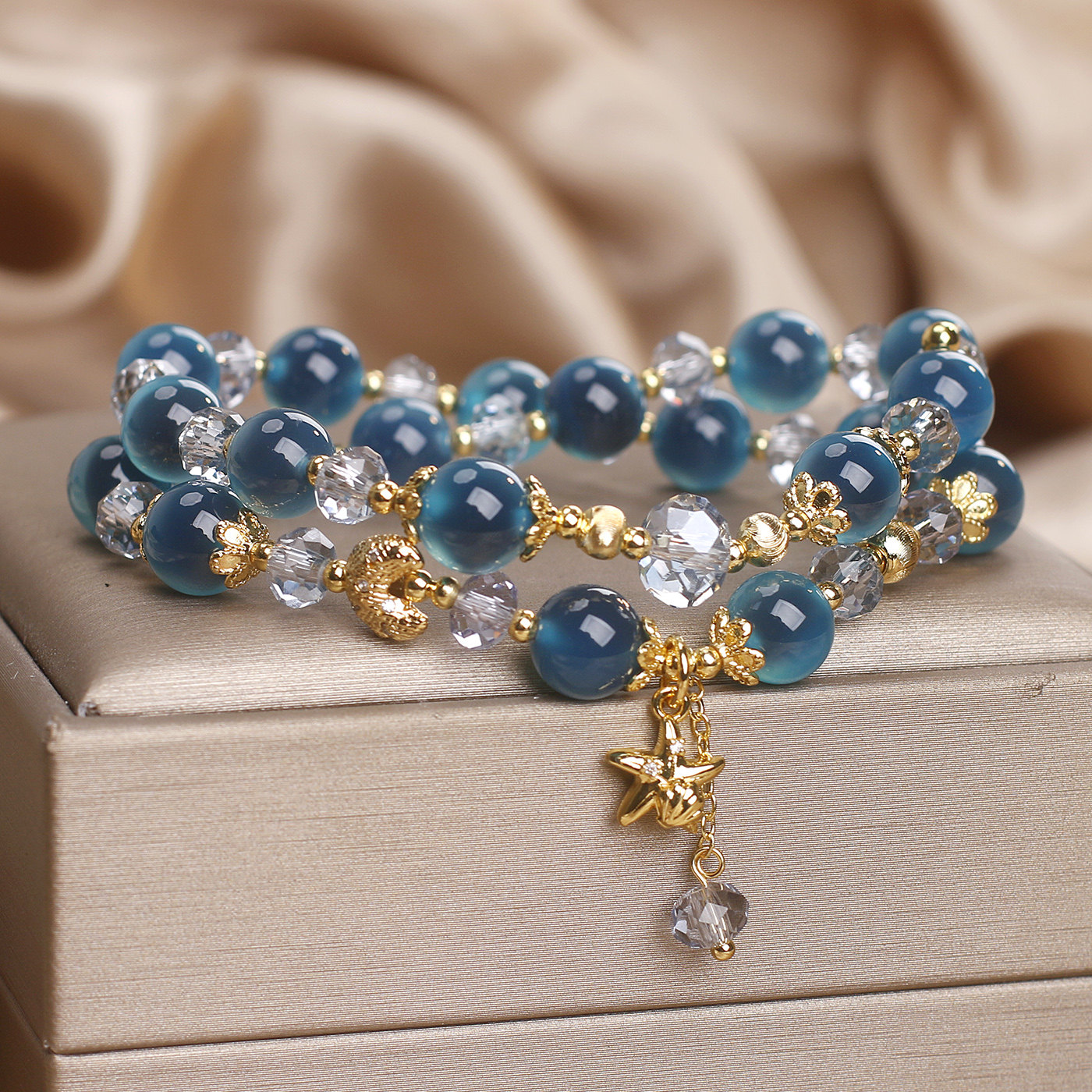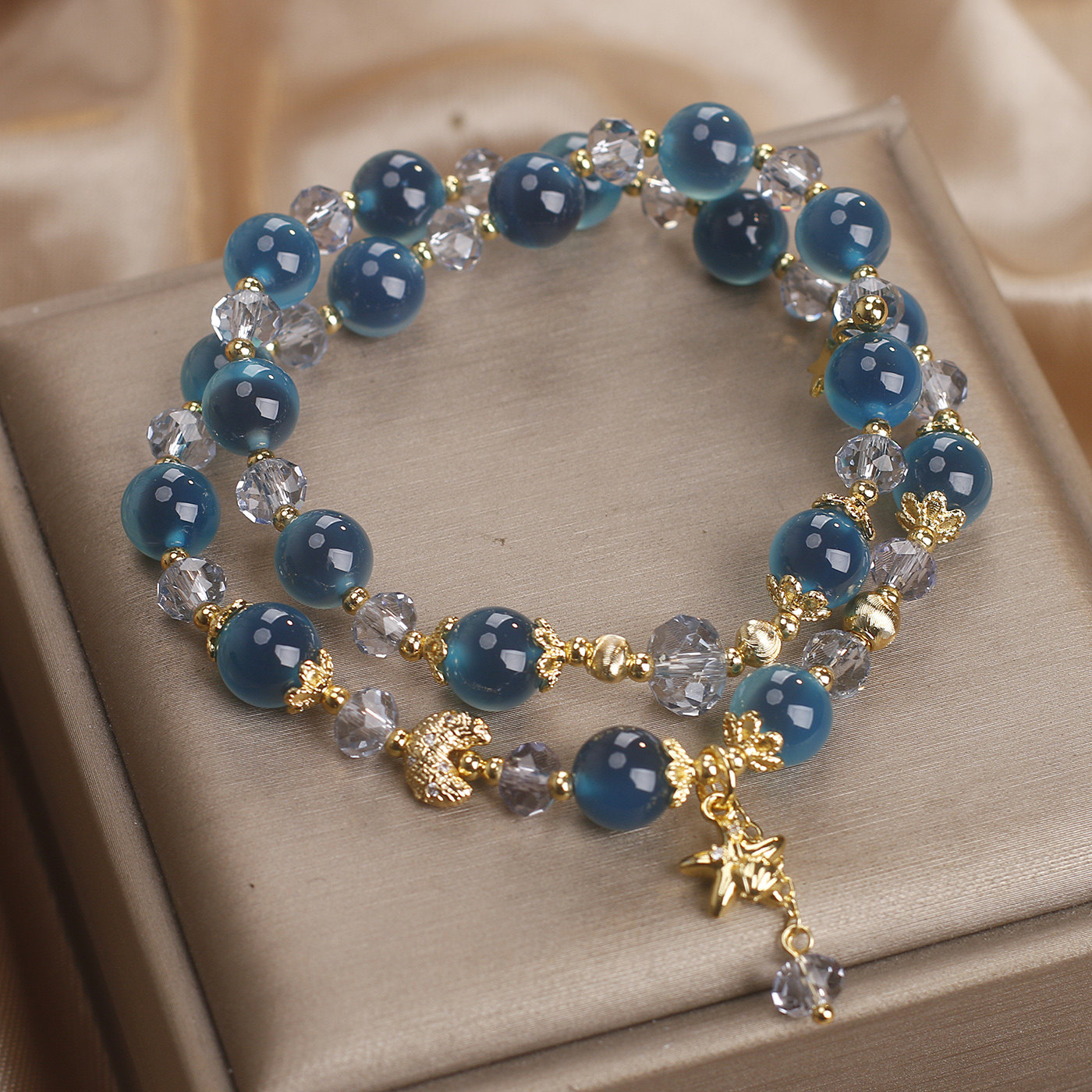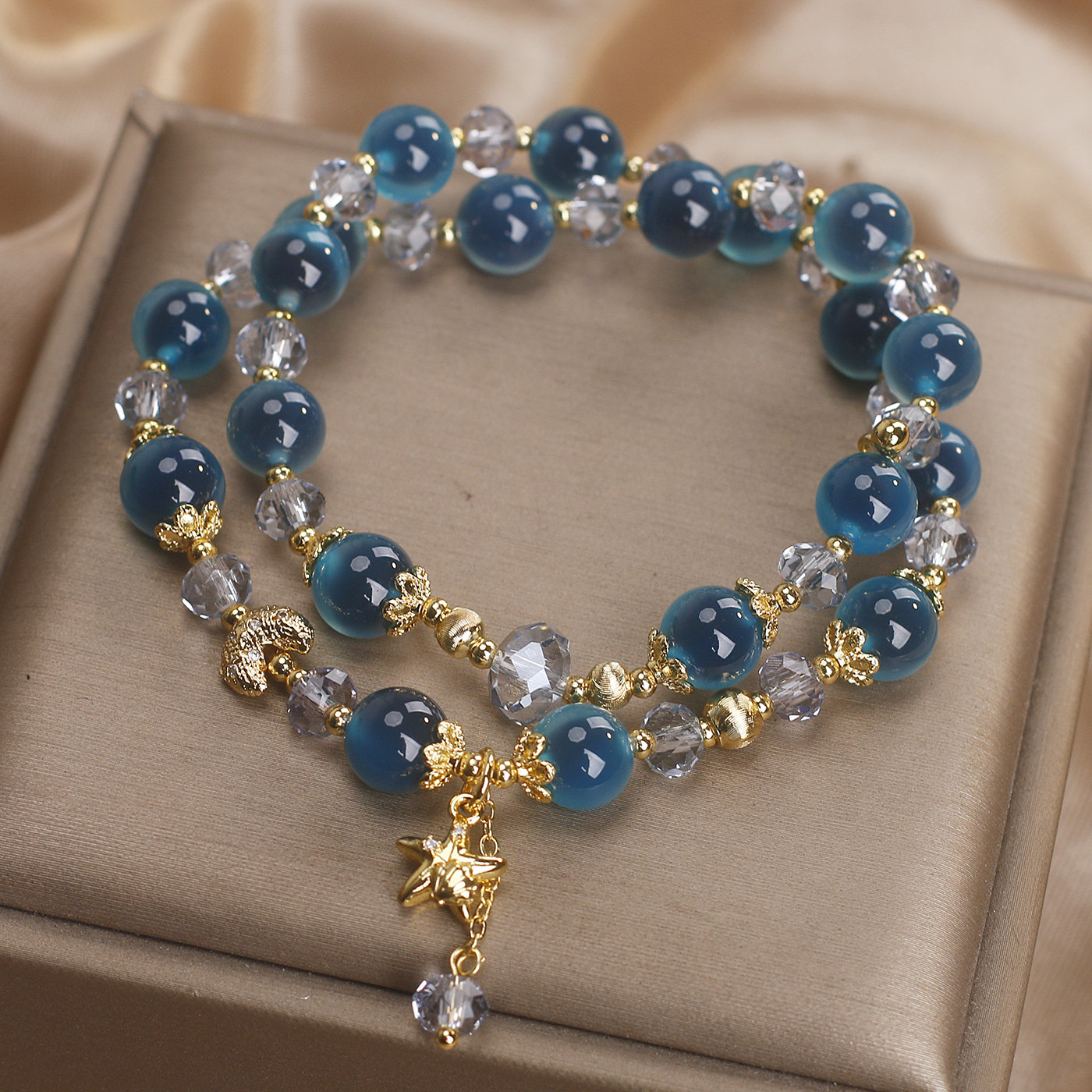 天然蓝色糖心玛瑙双层水晶手链女轻奢小众高级感海星吊坠双圈手串