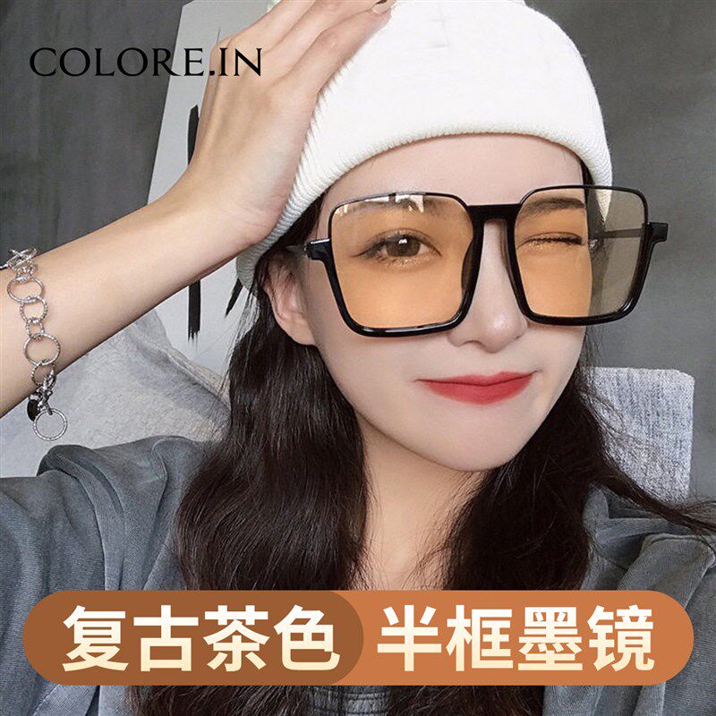 黑框茶色墨镜女潮复古半框网红款街拍级感橘黄色女士太阳眼镜夏