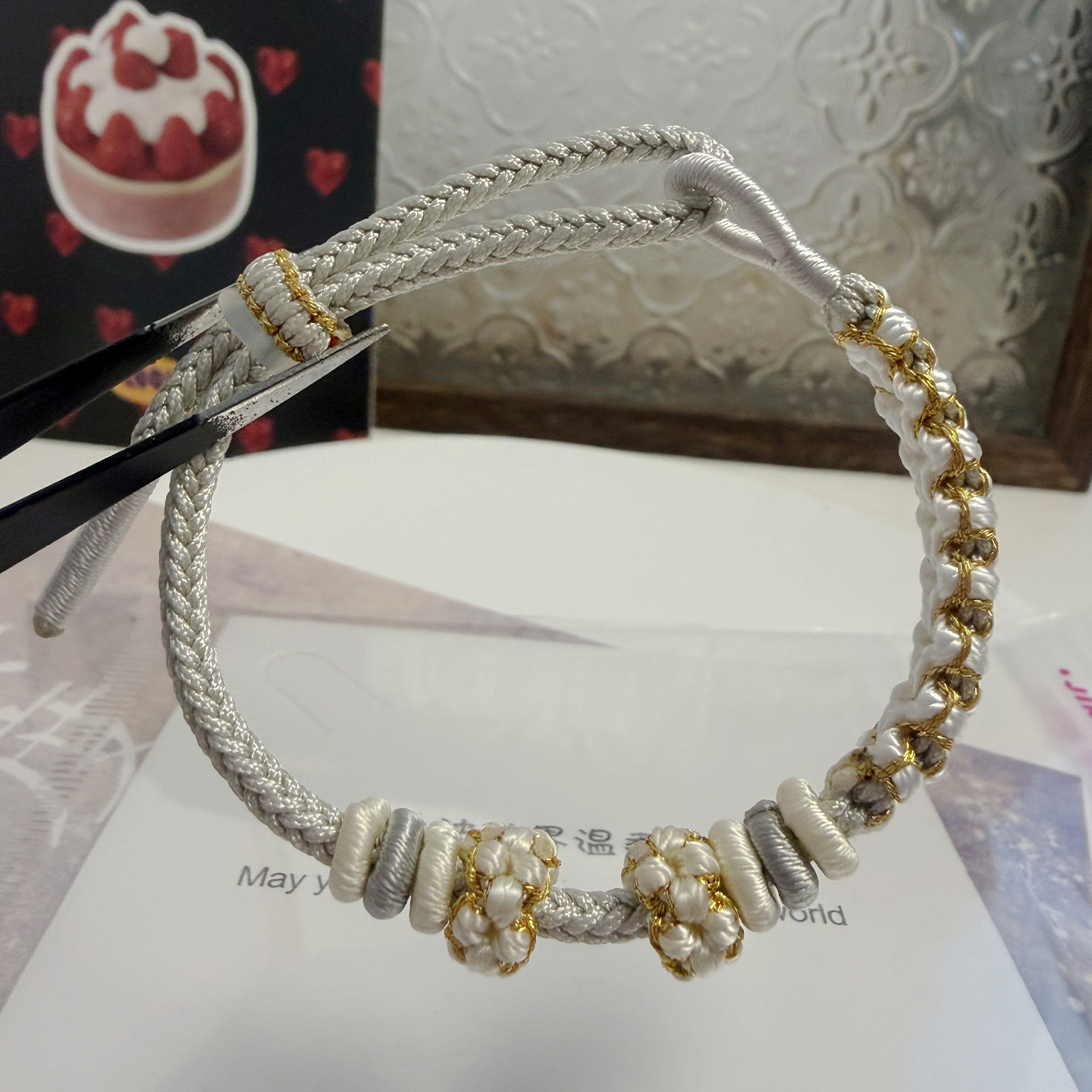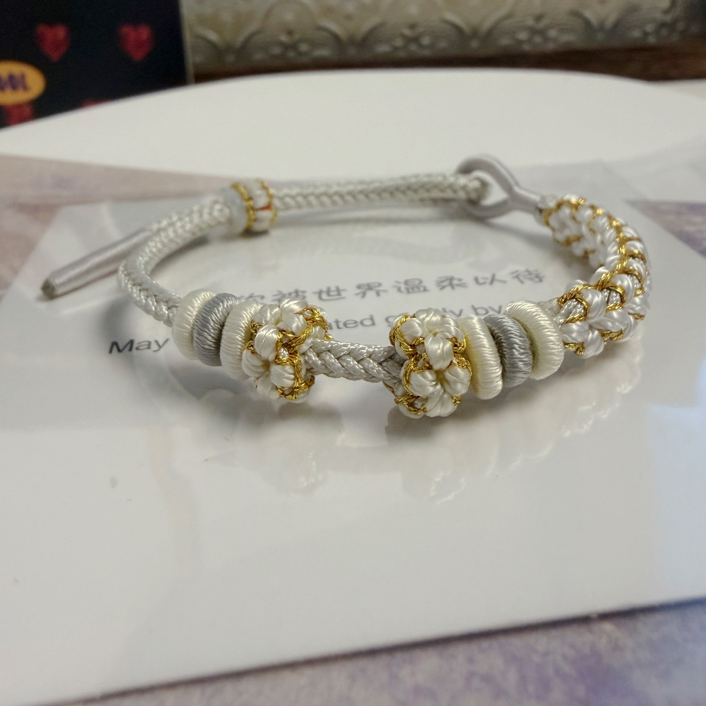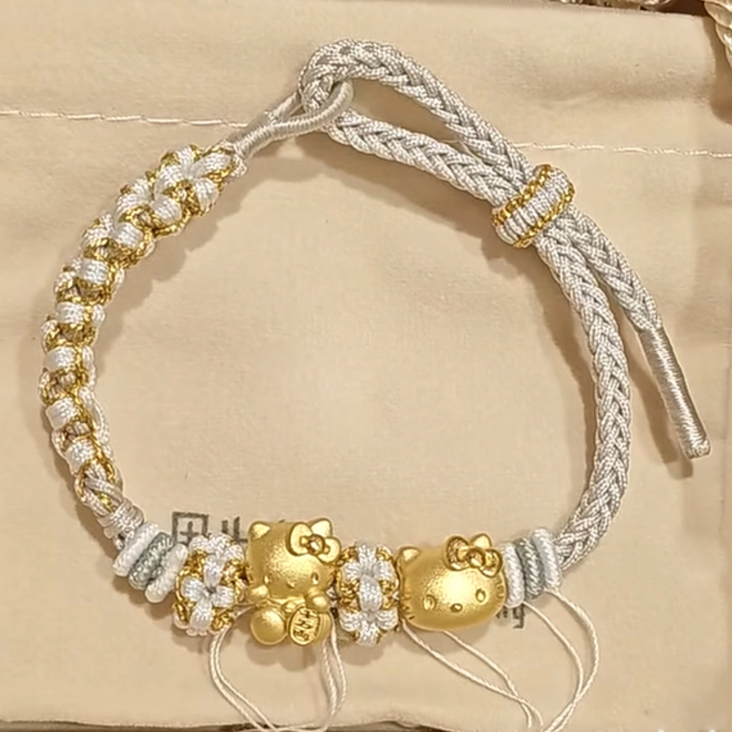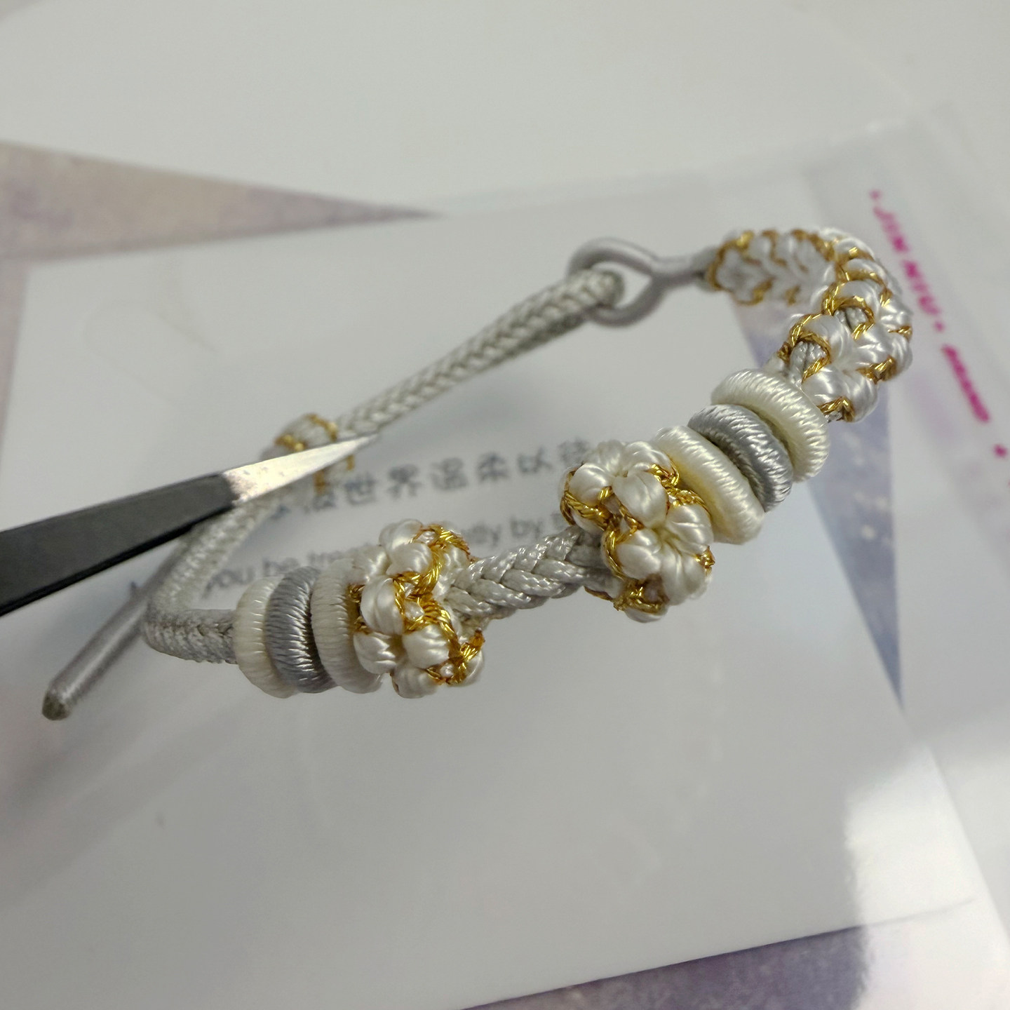 小清新桃花结DIY手绳灰白色手工编织绳可穿珠黄金转运珠编绳手链