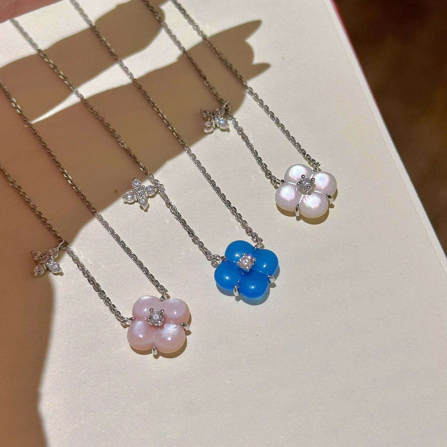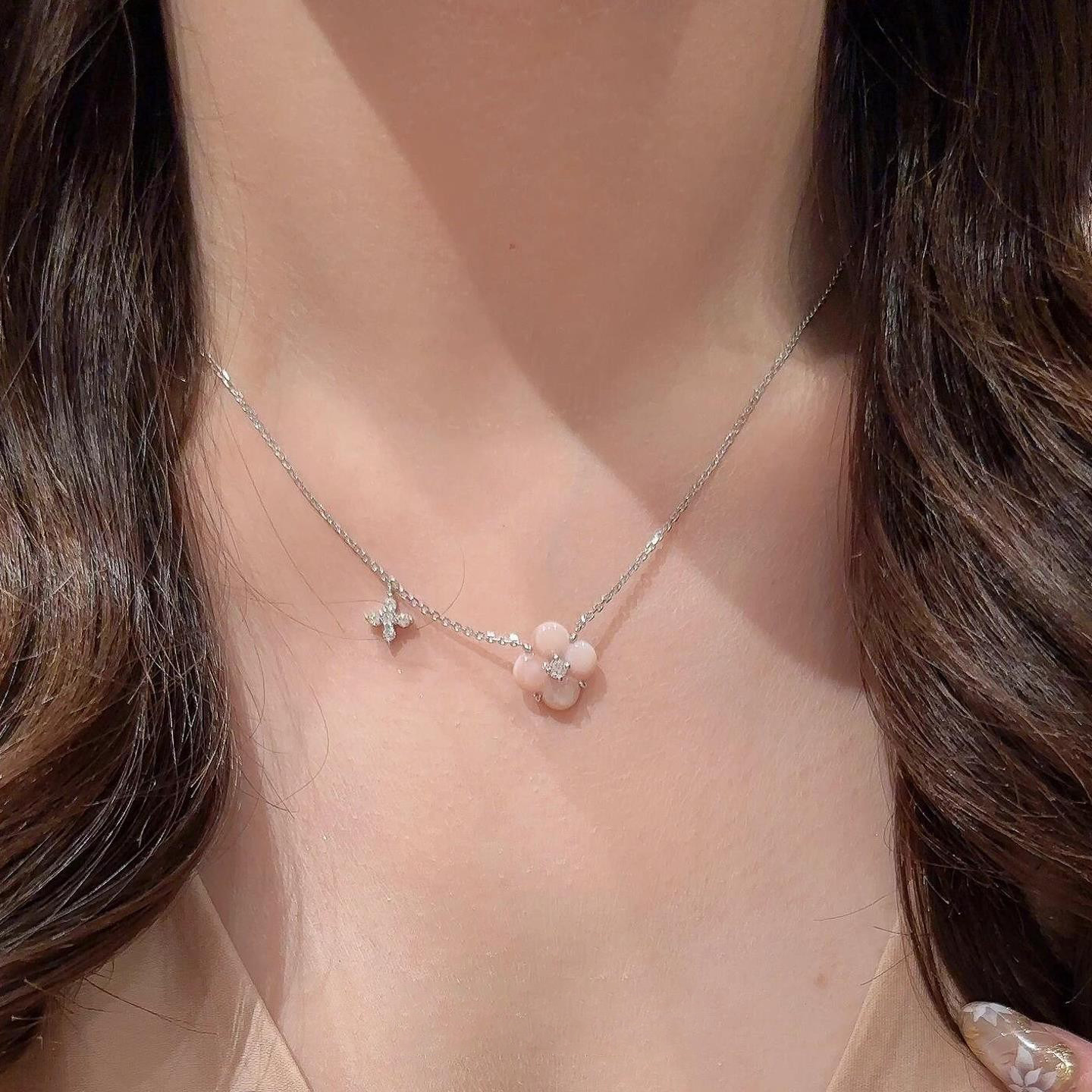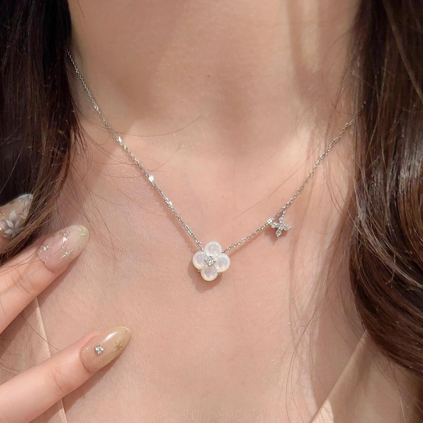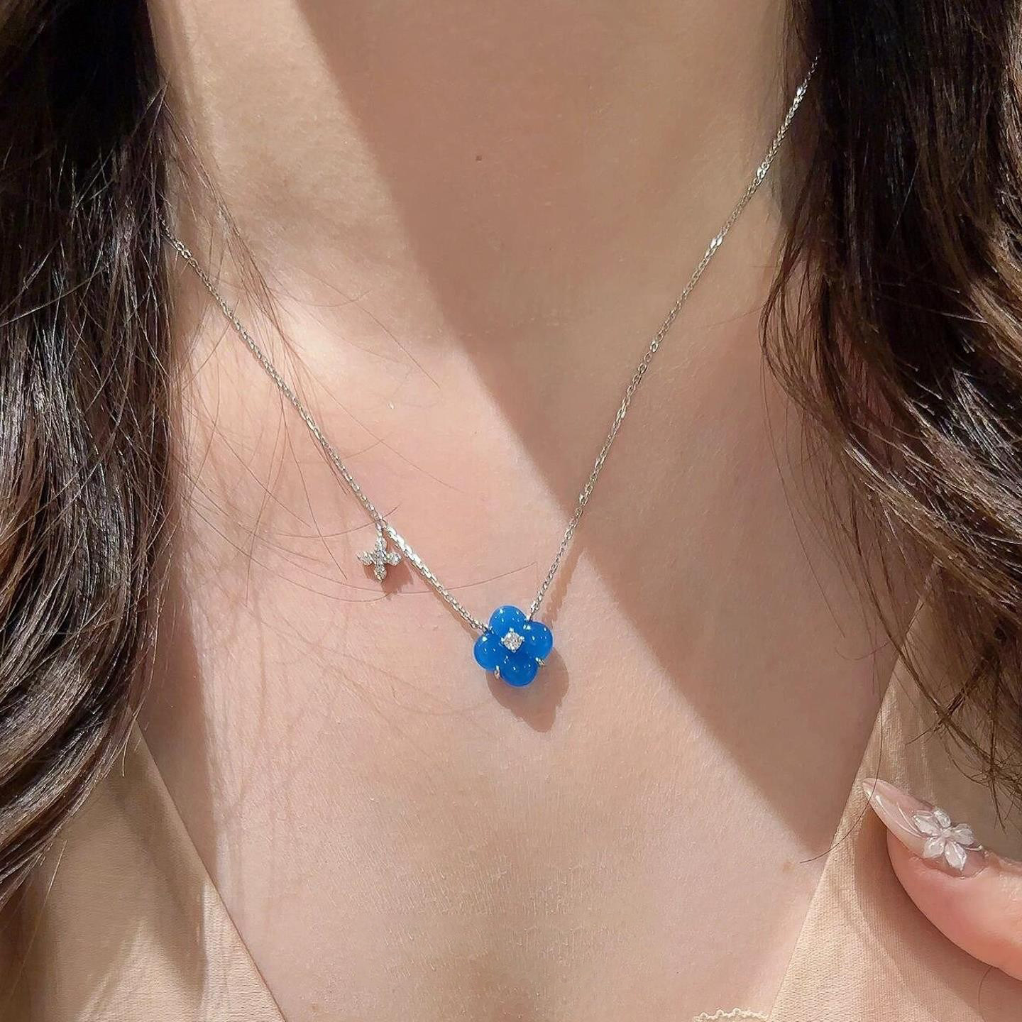 蓝色四叶花仿闪钻项链女2026新款爆款高级感小众设计锁骨颈链配饰