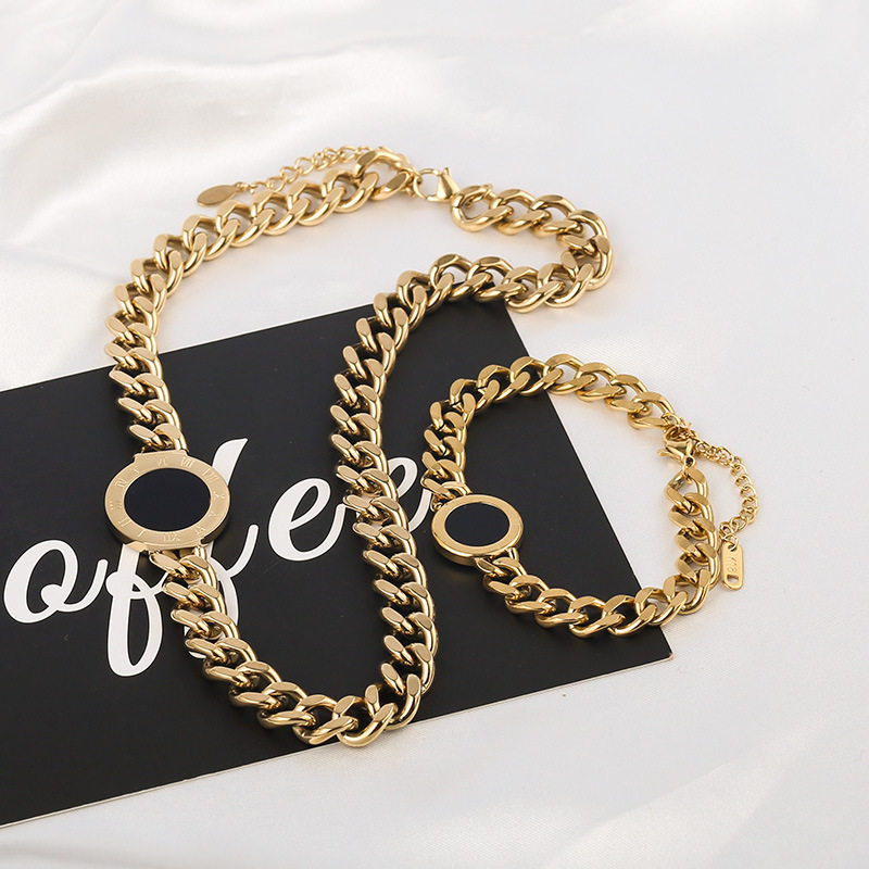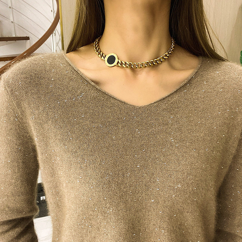 欧美夸张黑色圆牌粗链条钛钢项链网红同款个性锁骨链时尚毛衣链女