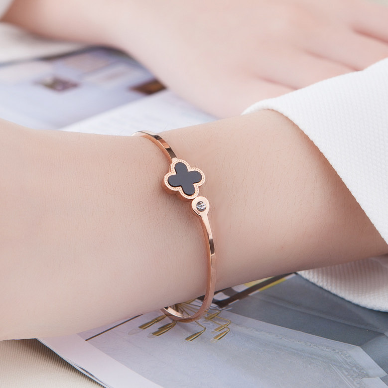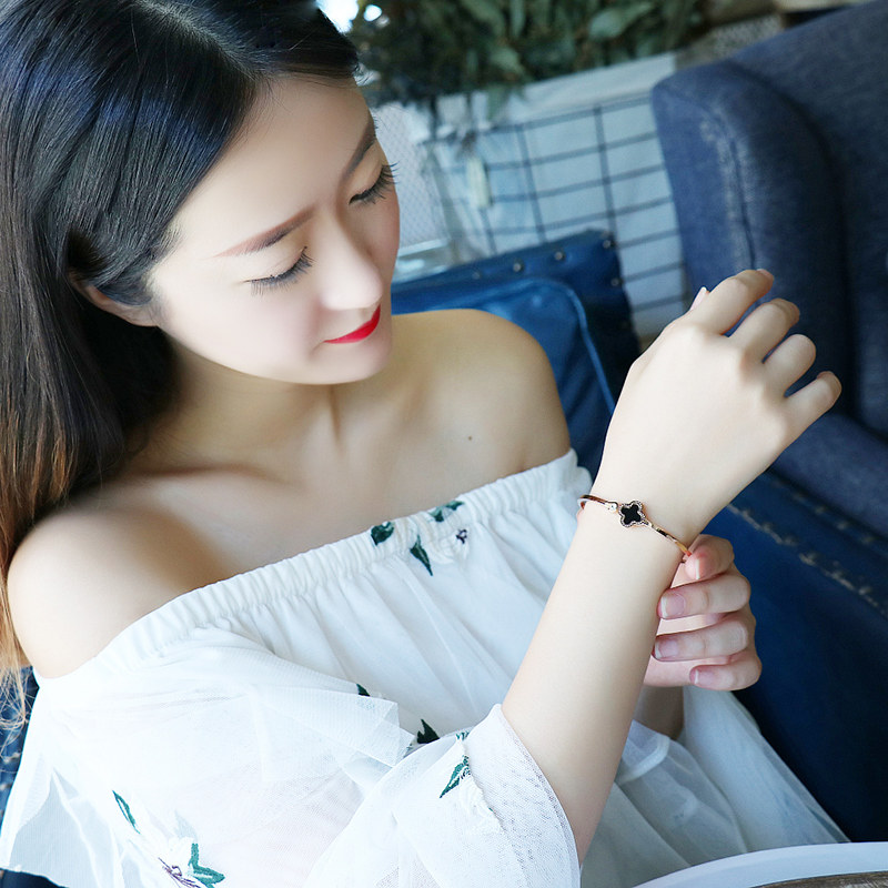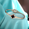 包邮气质日韩版彩金18K玫瑰金四叶草手镯女黑色钛钢开口手环饰品