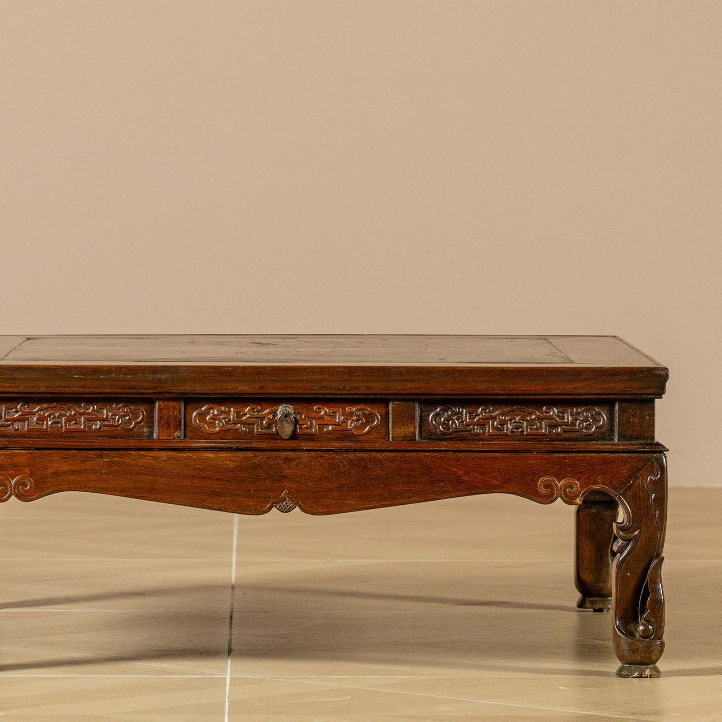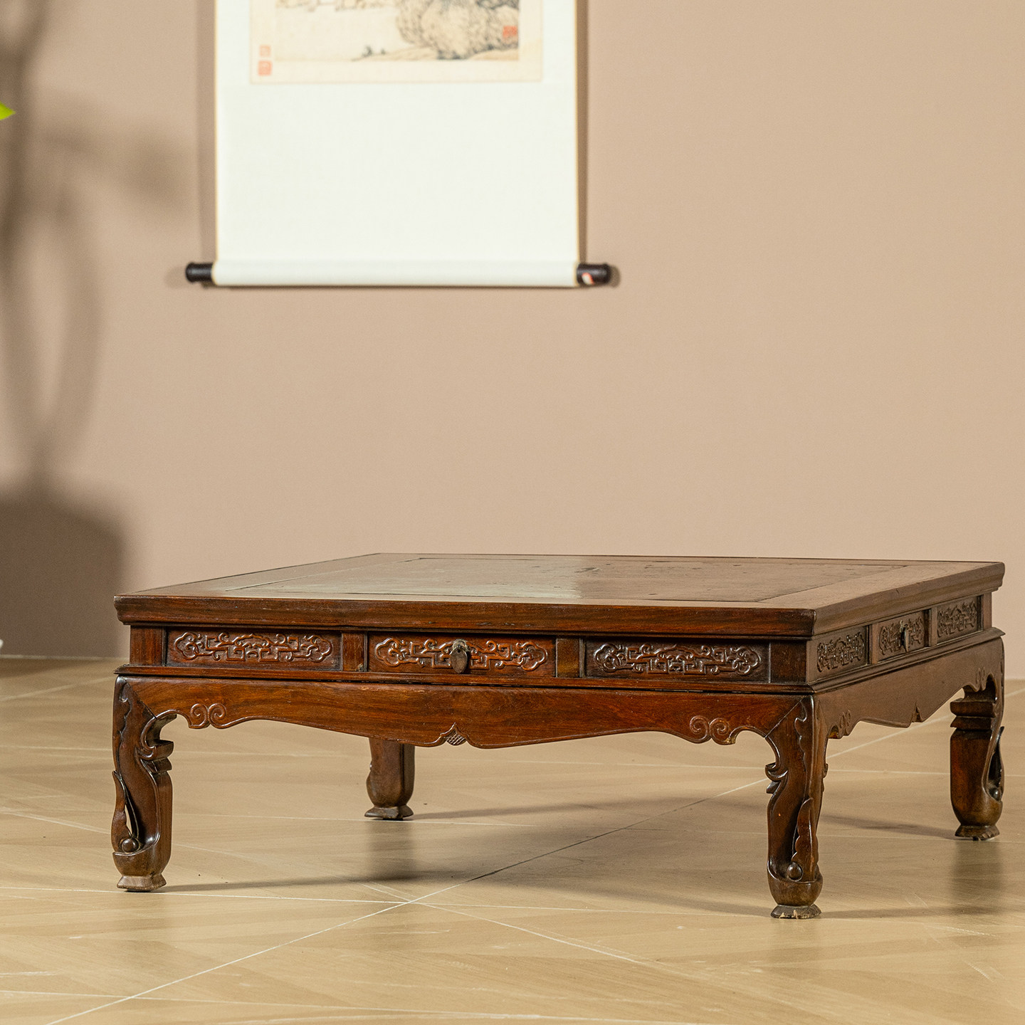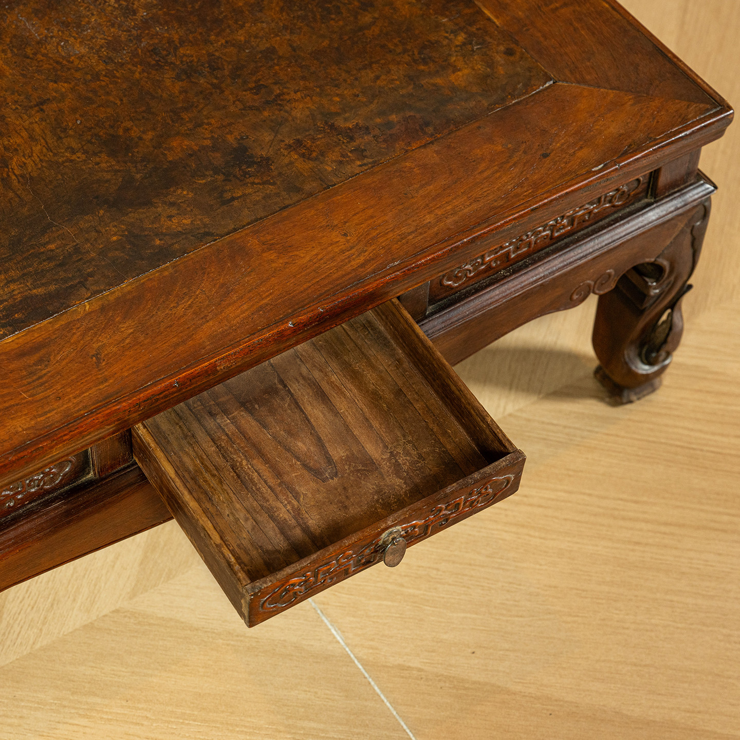 清中期黄花梨镶瘿木拦水线搞束腰三弯腿带屉炕桌古董收藏海黄茶台