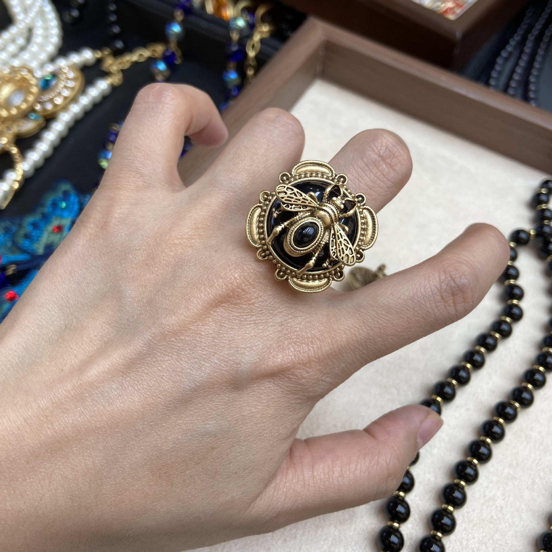 欧美个性俄罗斯金款复古昆虫动物飞蛾黑色串珠双层项链圆形毛衣链
