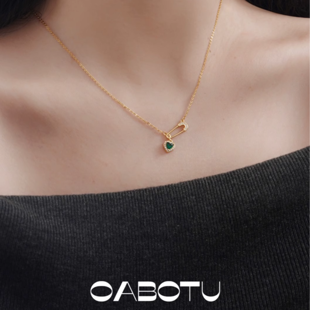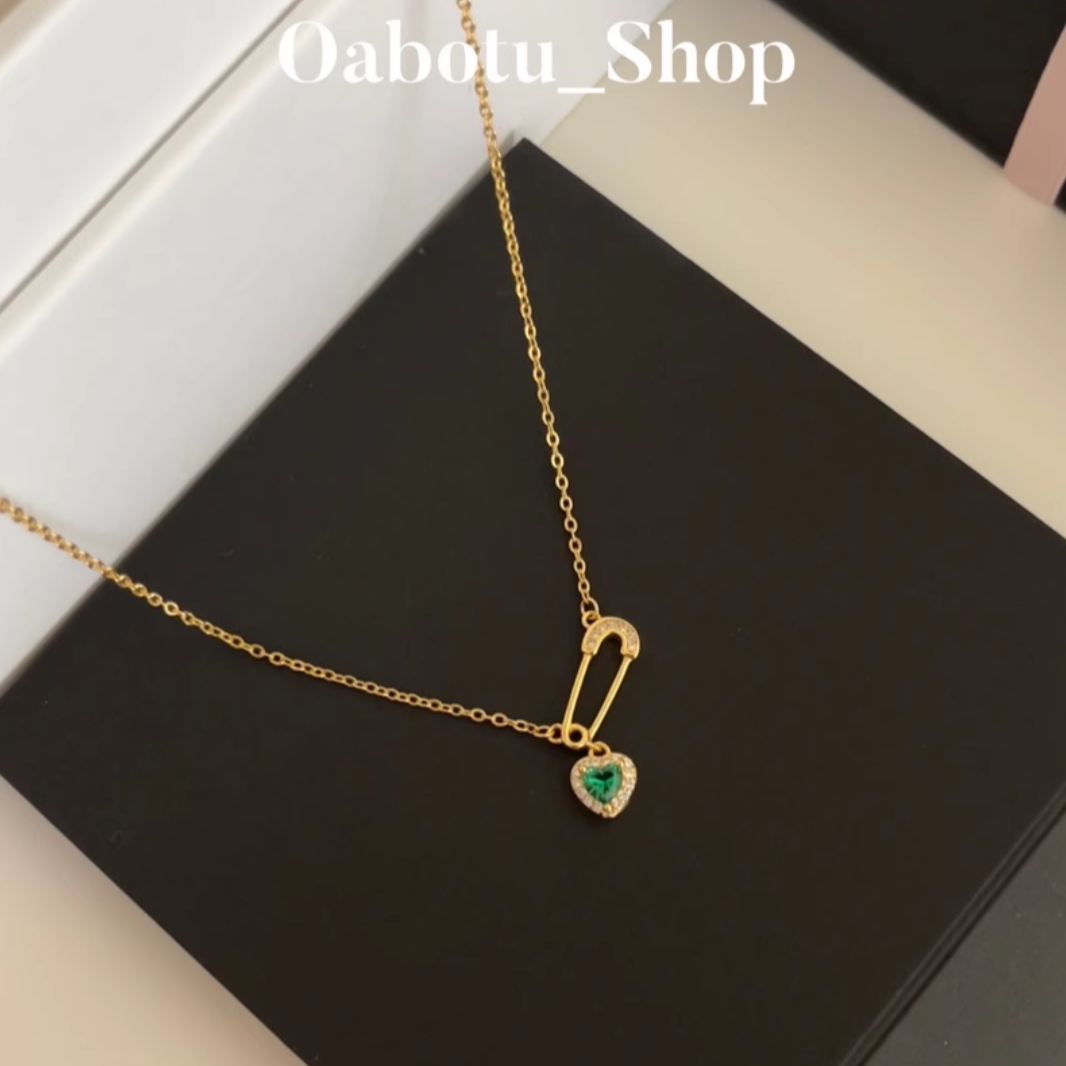 绿色爱心别针项链(通体925纯银镀金材质、镶嵌锆石)