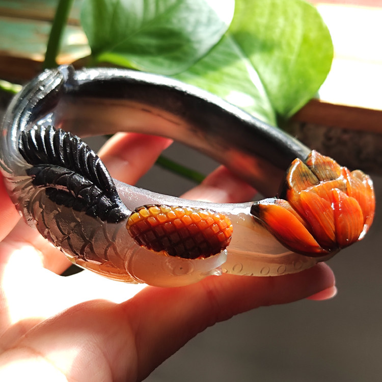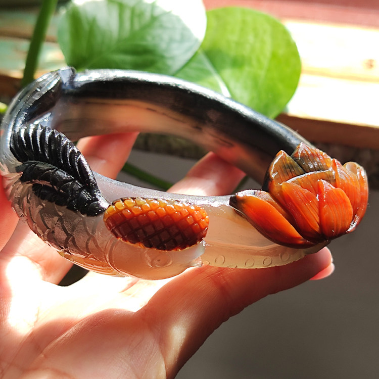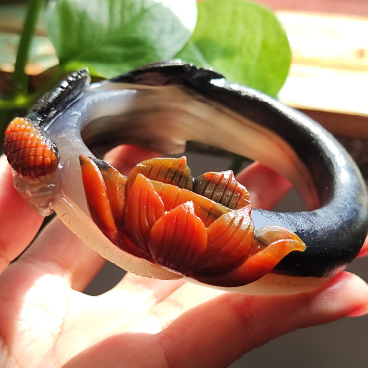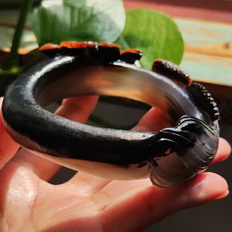 水墨荷塘 纯天然巴西老料玛瑙雕刻手镯 稀有高品质黑红撞色62