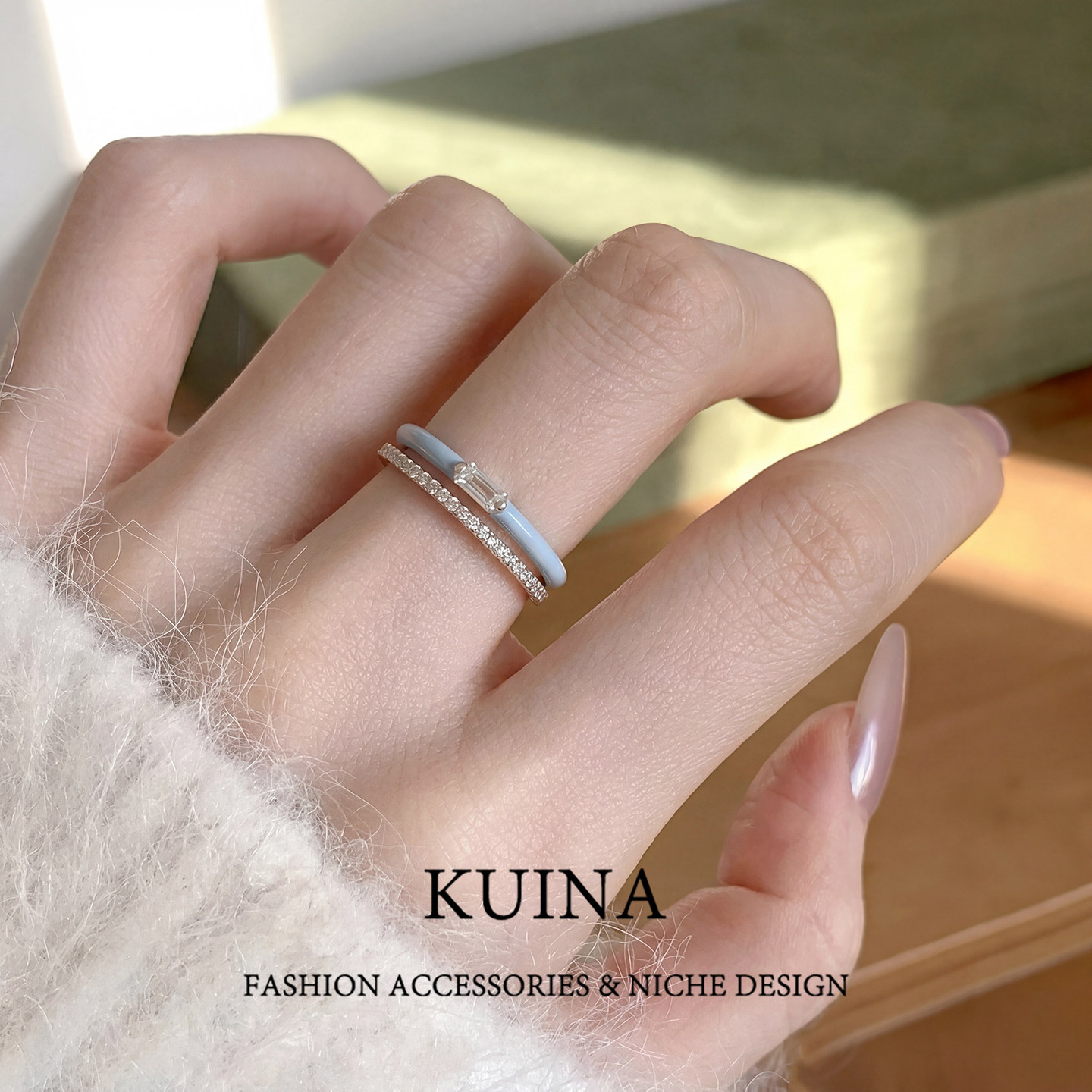 小众设计感镶钻蓝色戒指女可调节开口戒叠戴素圈套戒轻奢百搭配饰