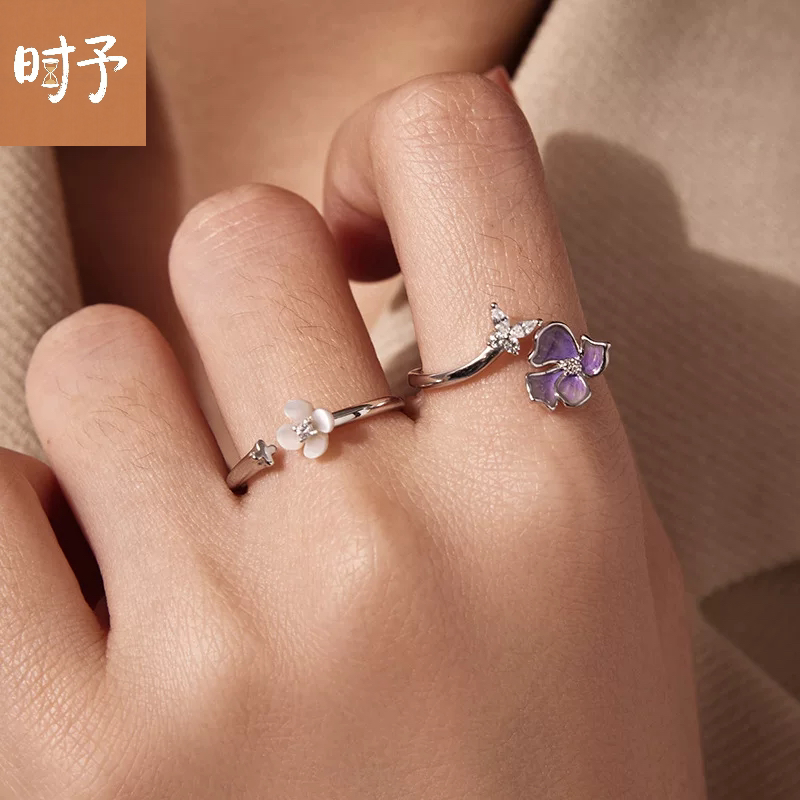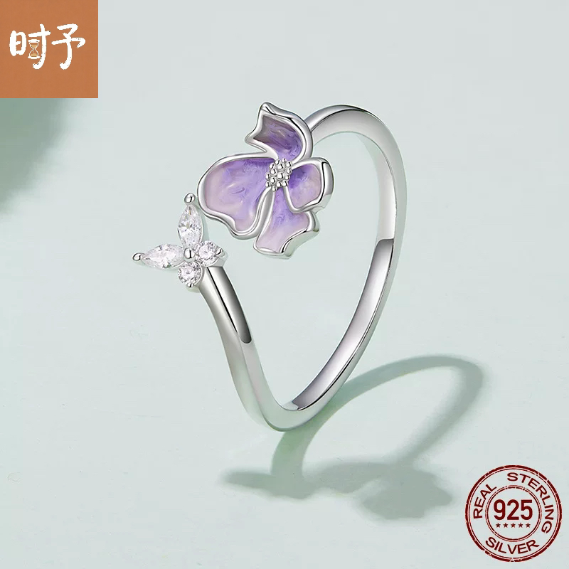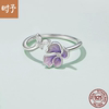 原创紫色小花蝴蝶开口戒指温柔优雅风通体s925纯银花朵指环戒指