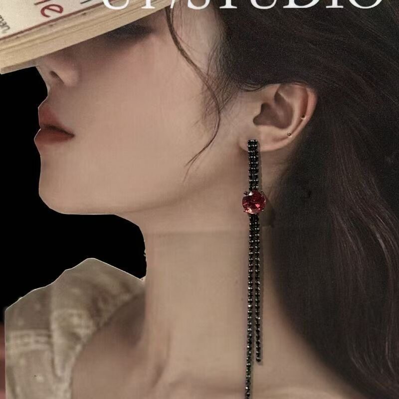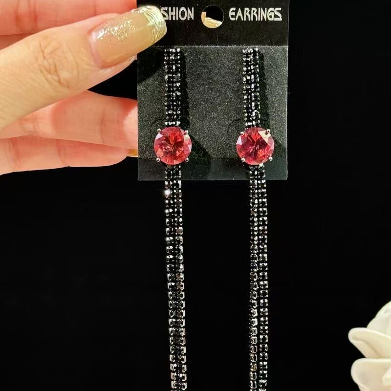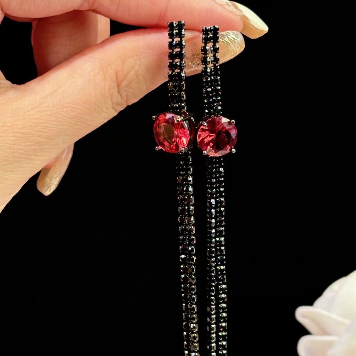 黑色长款耳环女高级感轻奢网红满钻气质红水水晶复古冷淡风耳饰