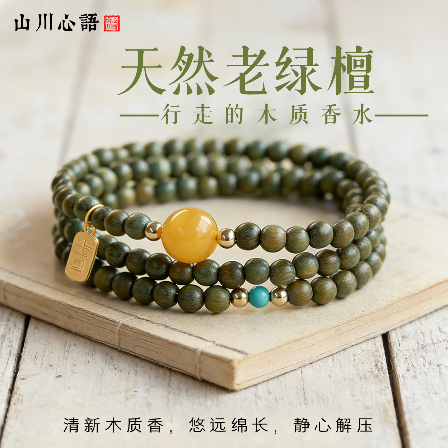 小米珠手链叠戴女款绿檀木手串三圈4mm天然绿色木质国风多圈