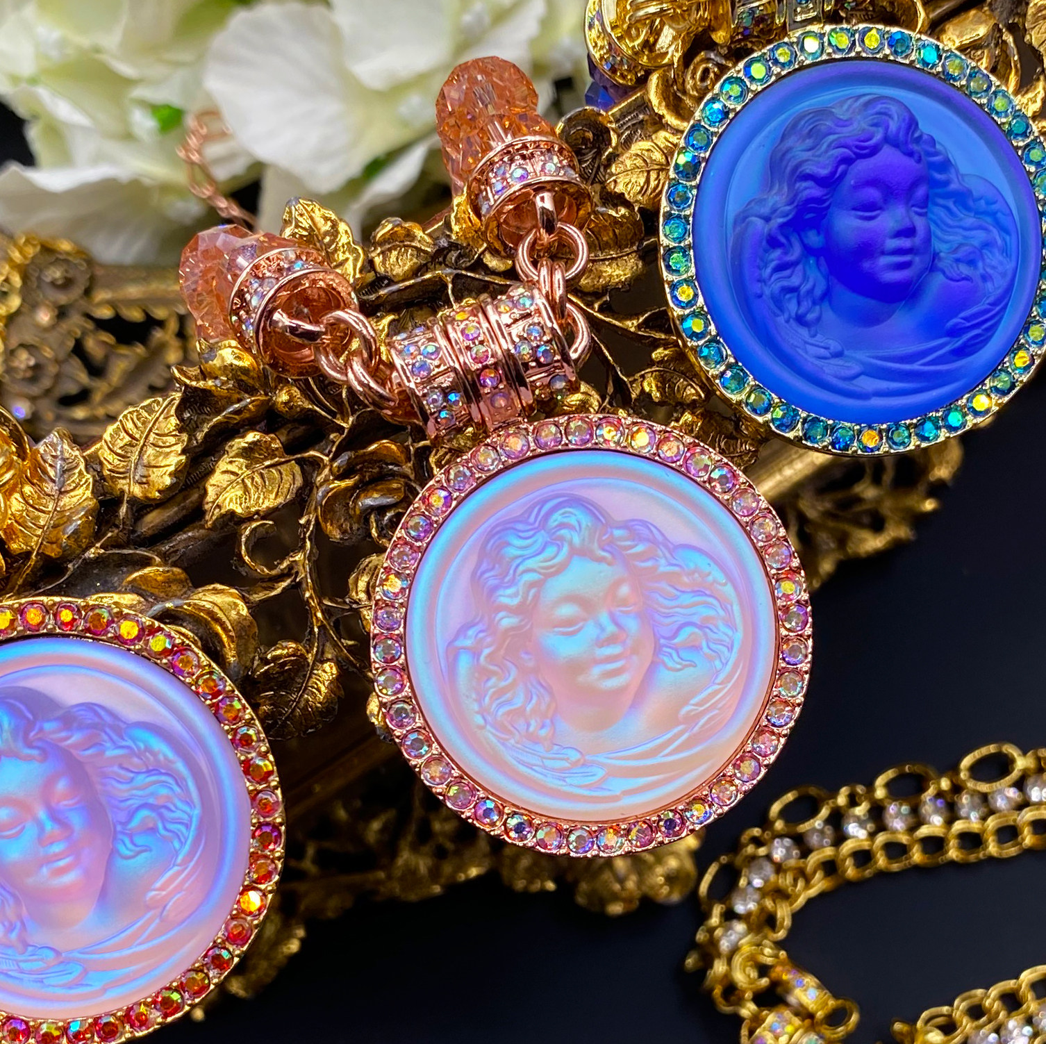 Kirks Folly摩恩脸月亮面睡梦天使玻璃浮雕磁吸吊坠项链