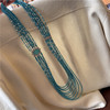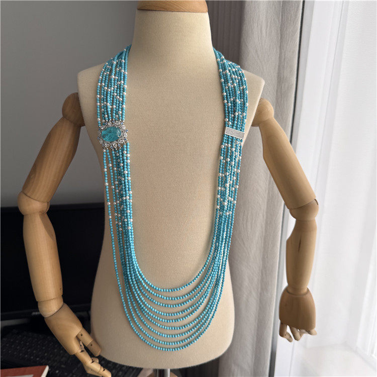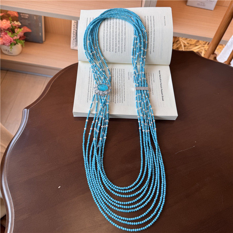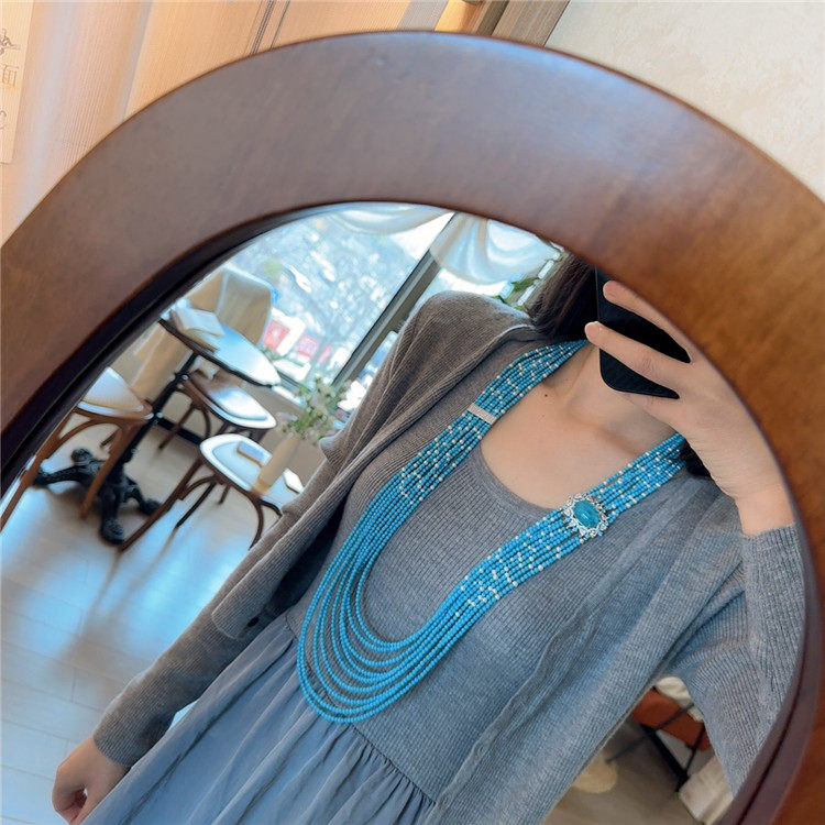 蓝色系多层串珠项链女小众设计高级感多层长款珍珠毛衣链复古首饰