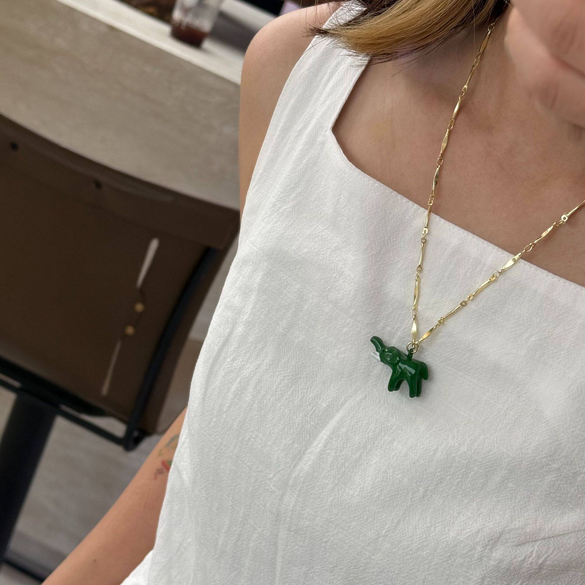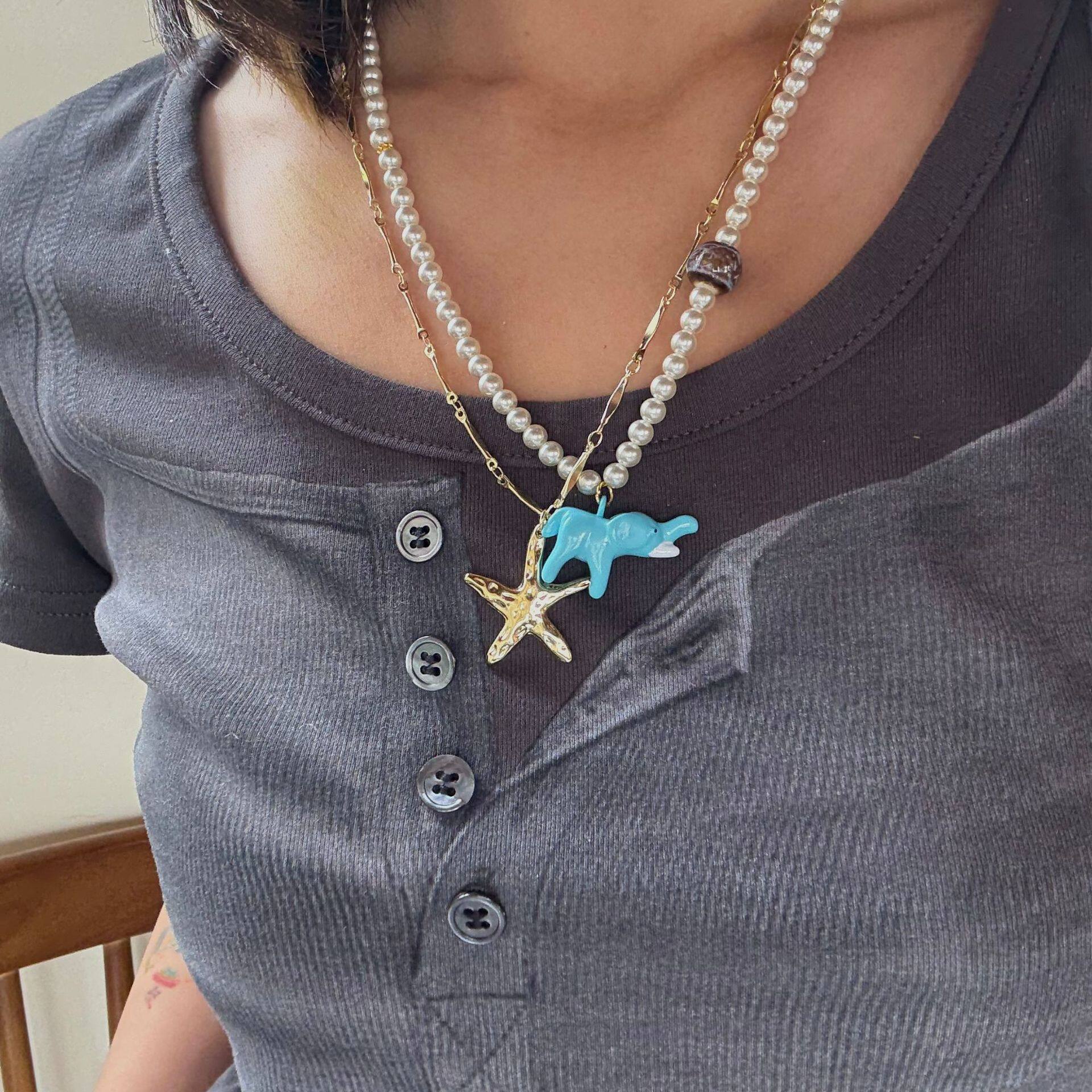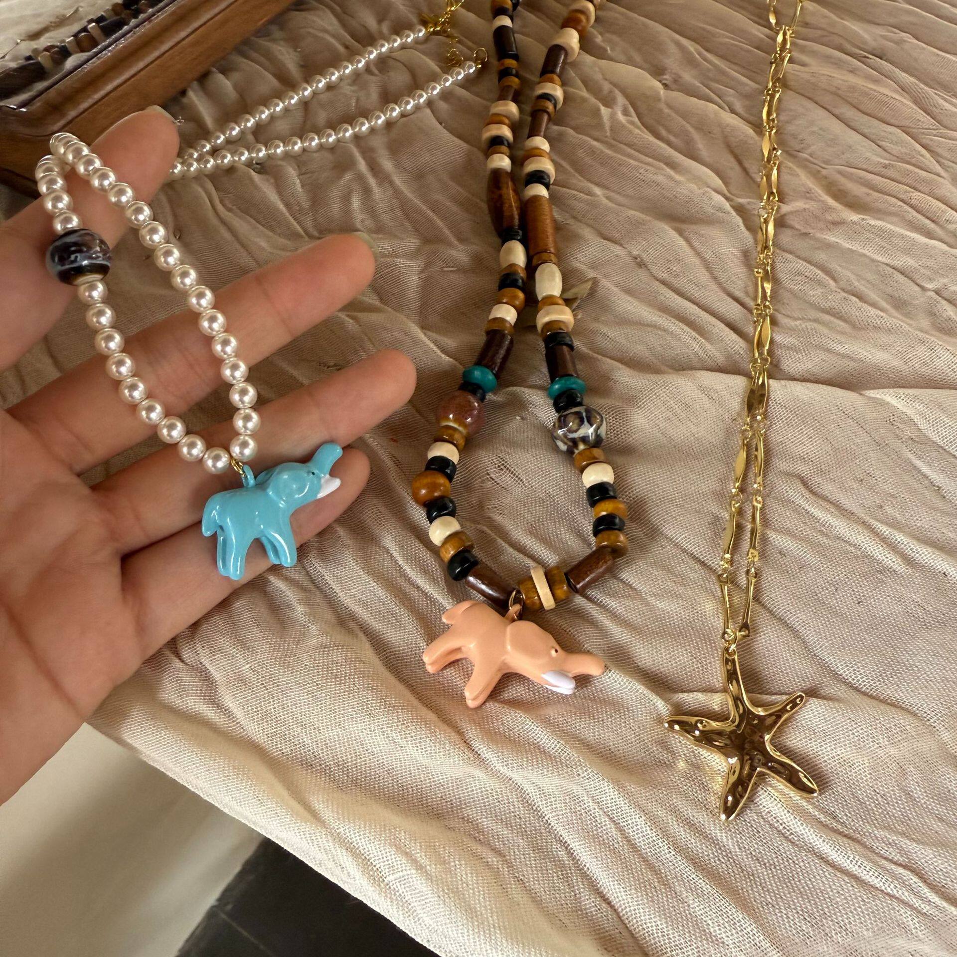 新款棕色串珠搭立体小象海星珍珠绿色项链小众设计高级感锁骨链女