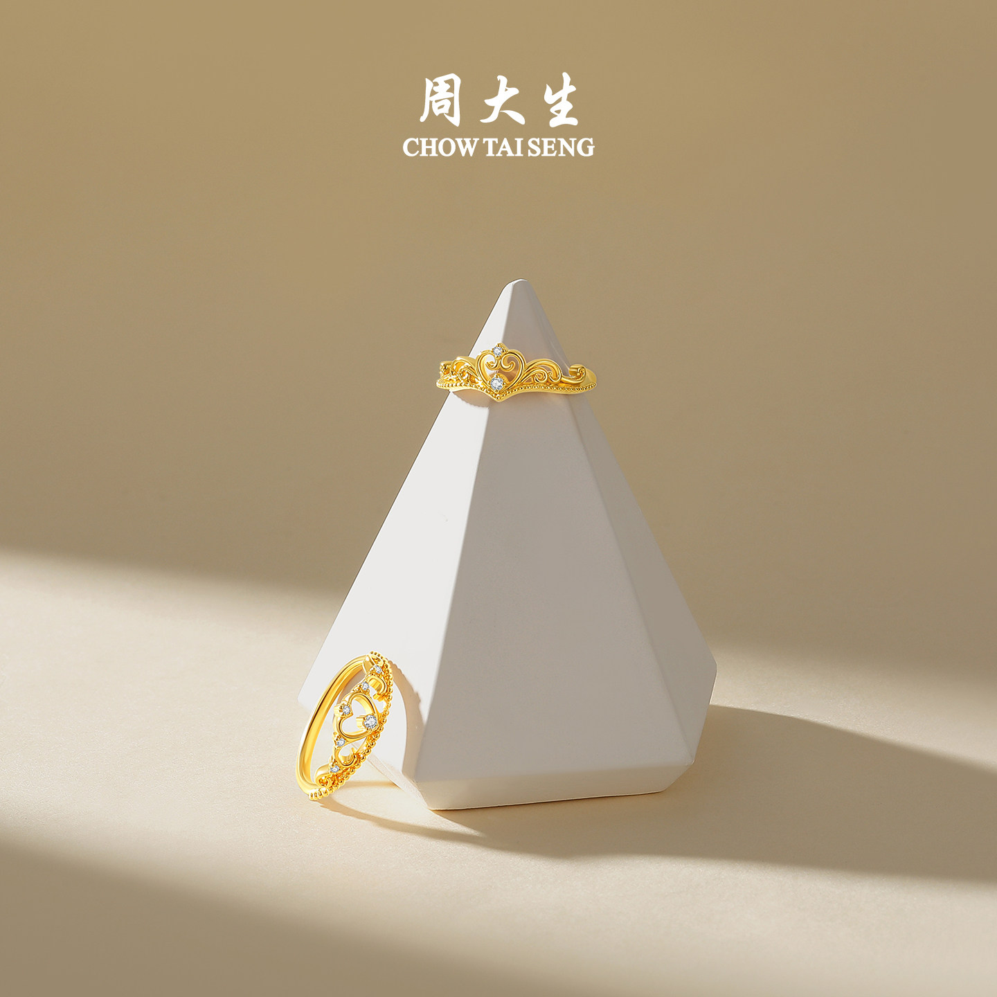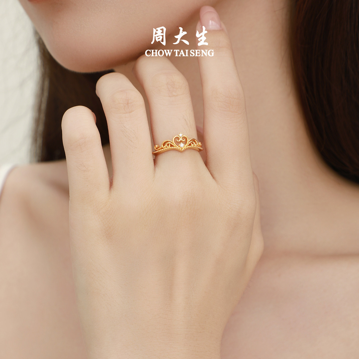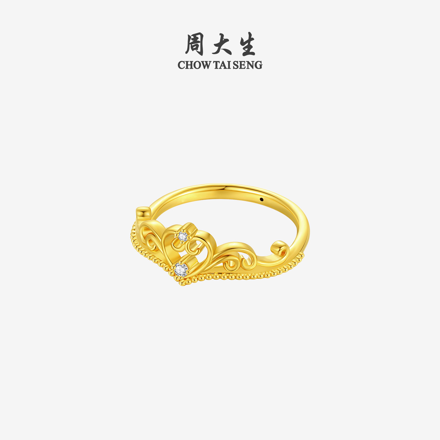 周大生公主皇冠黄金钻戒女5D足金爱心钻石戒指生日礼物送女友