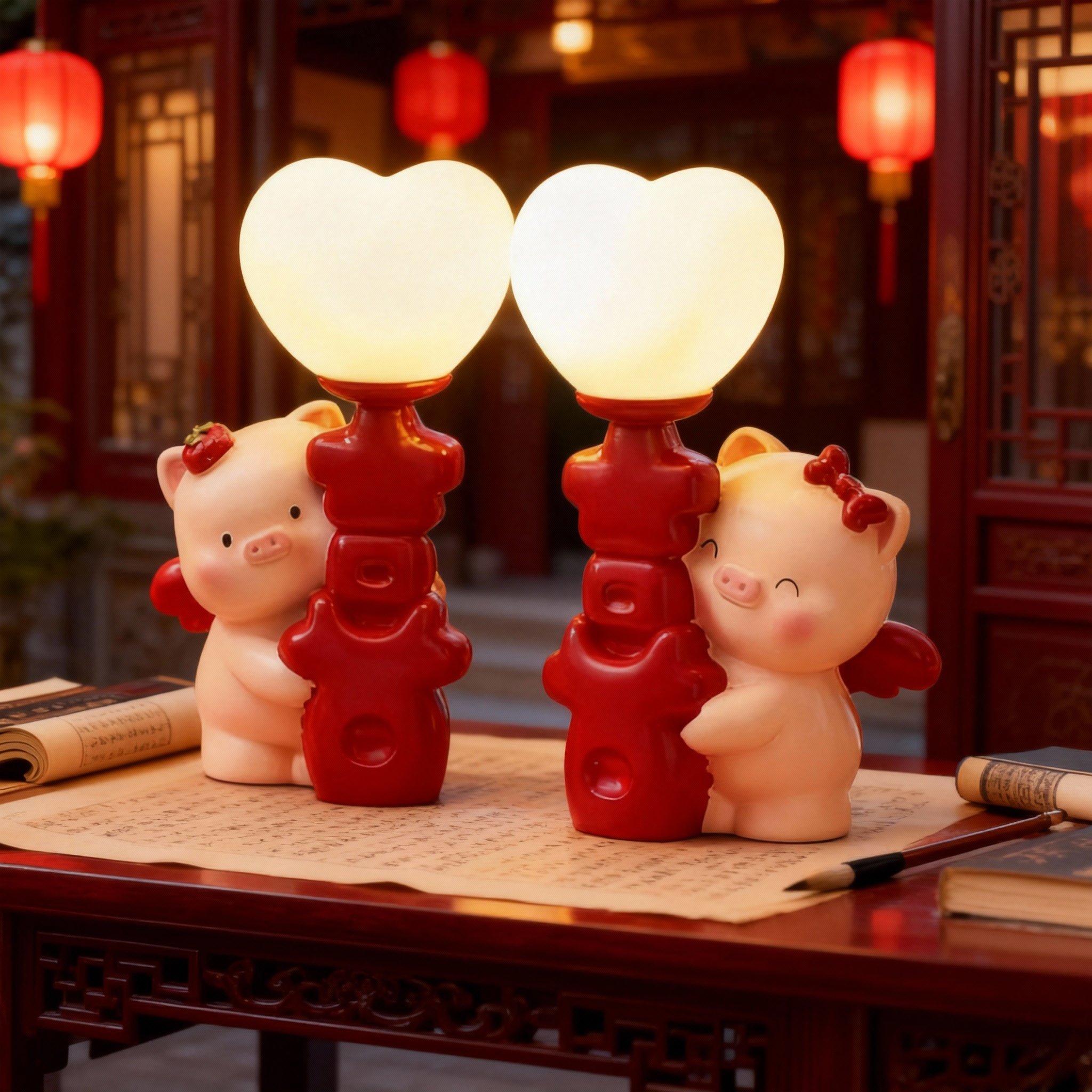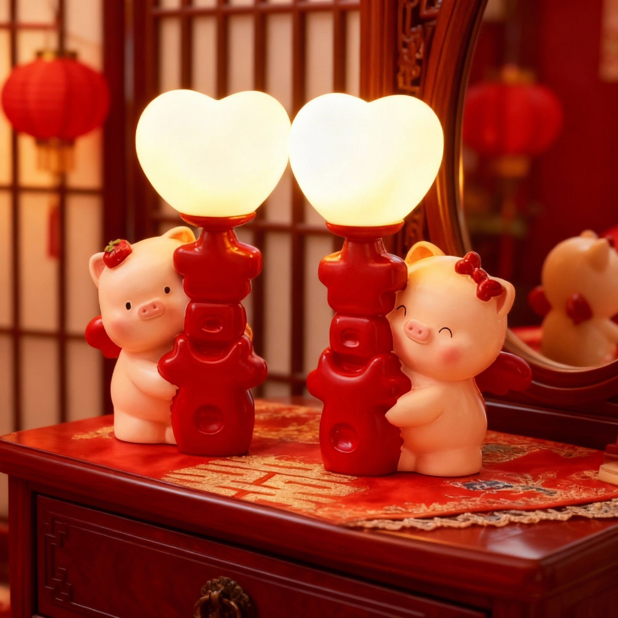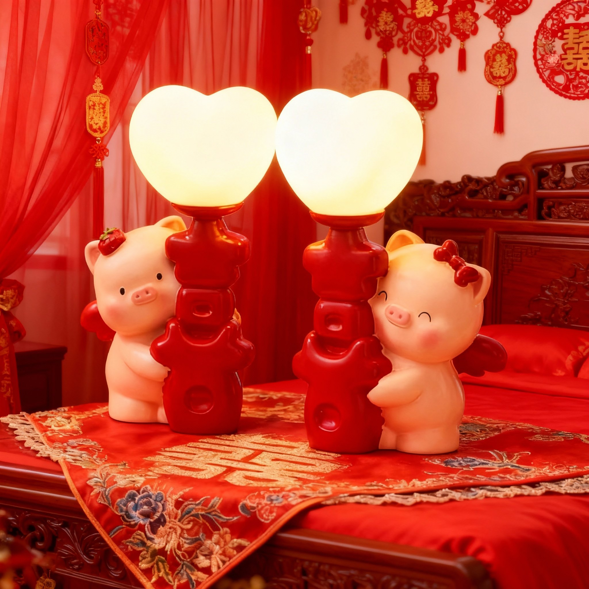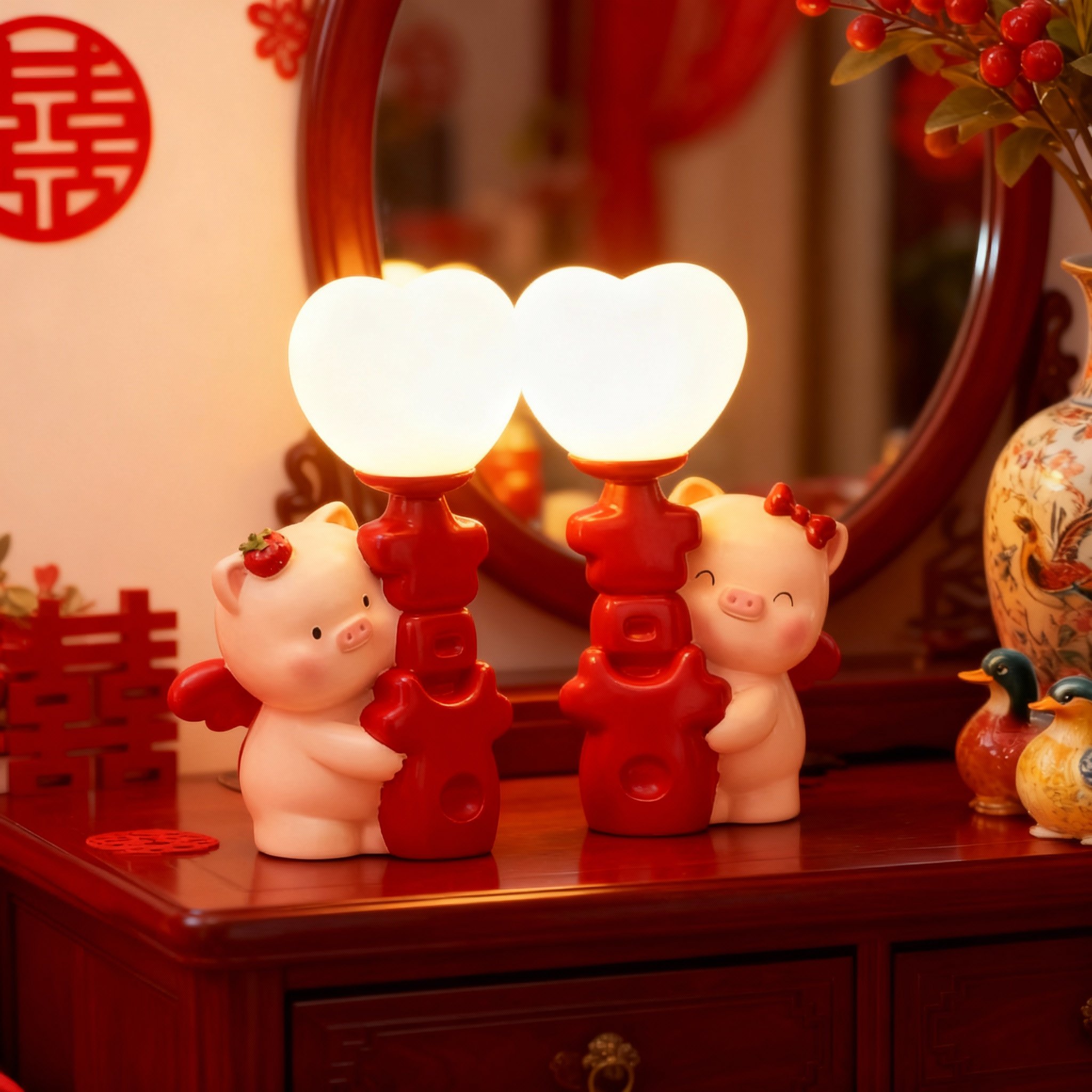 可爱小猪台灯红色心形灯罩装饰摆件卧室客厅树脂工艺品