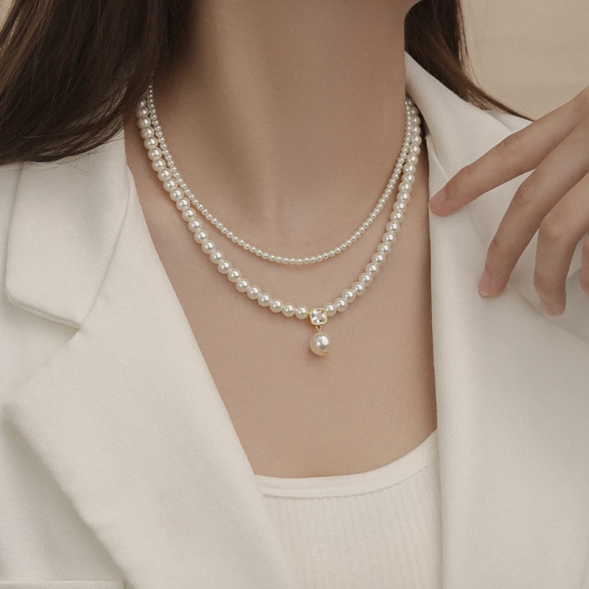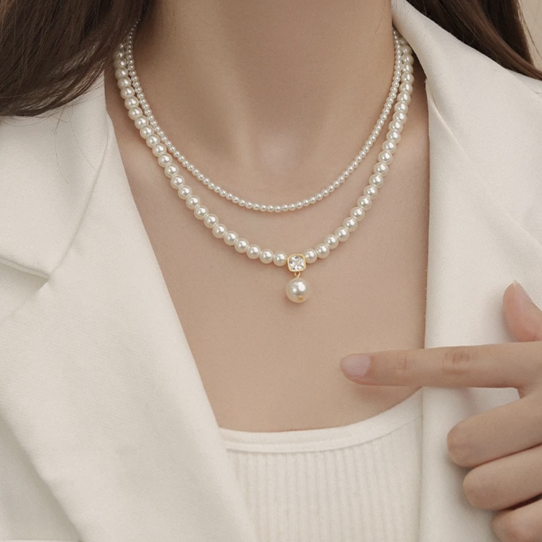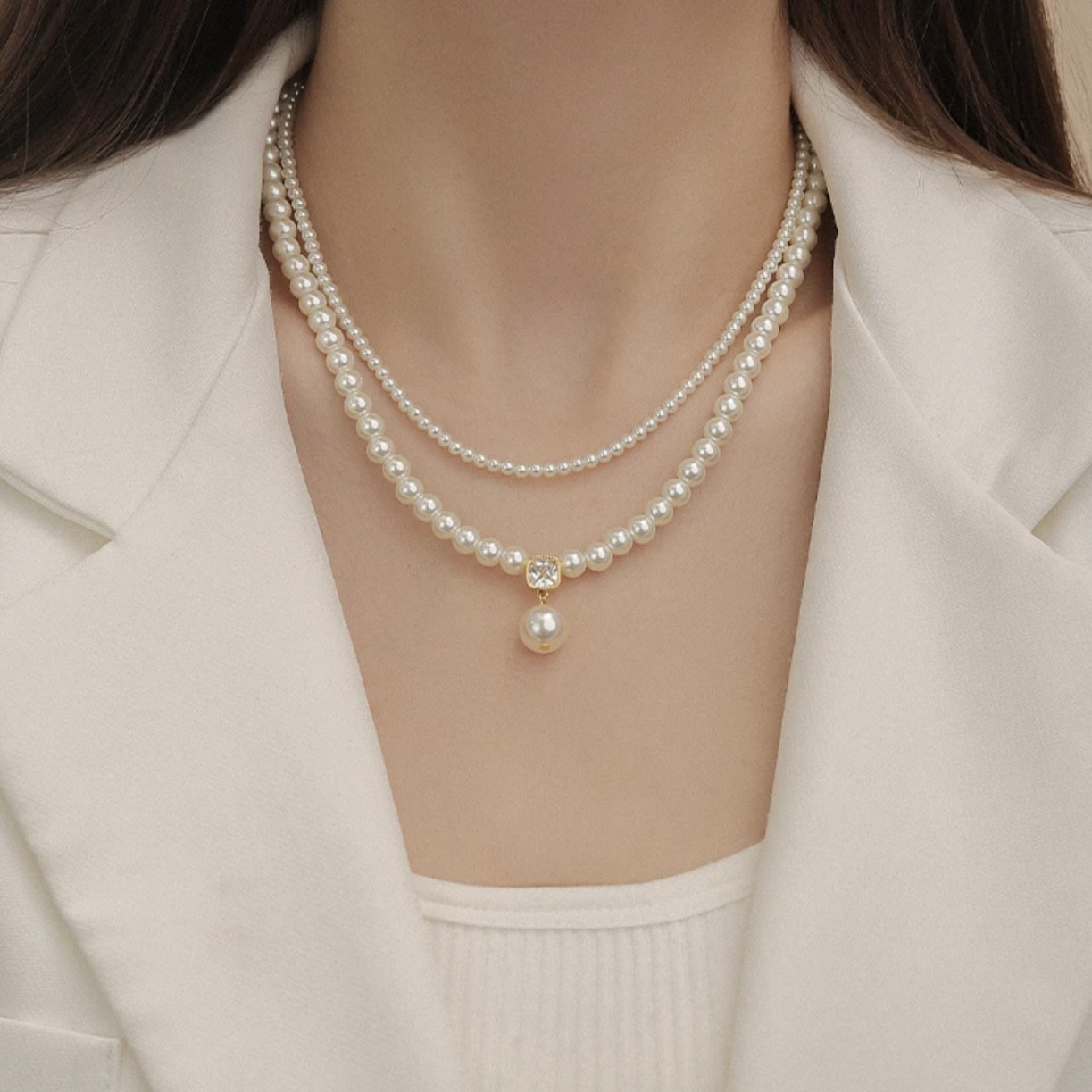 双层叠戴锆石吊坠珍珠项链女小众设计锁骨链2025新款爆款气质颈链