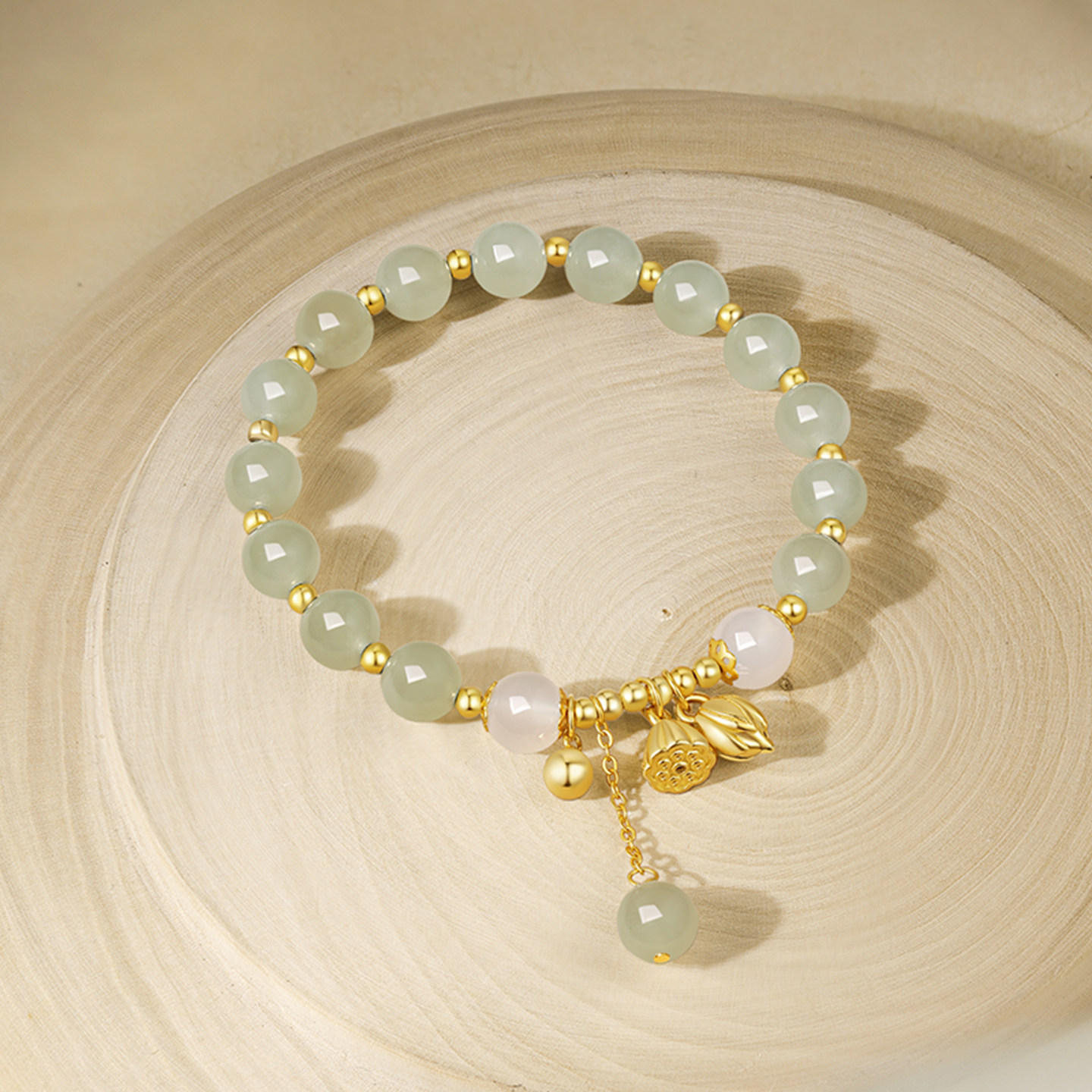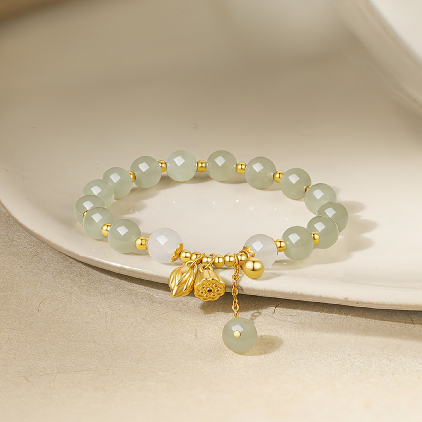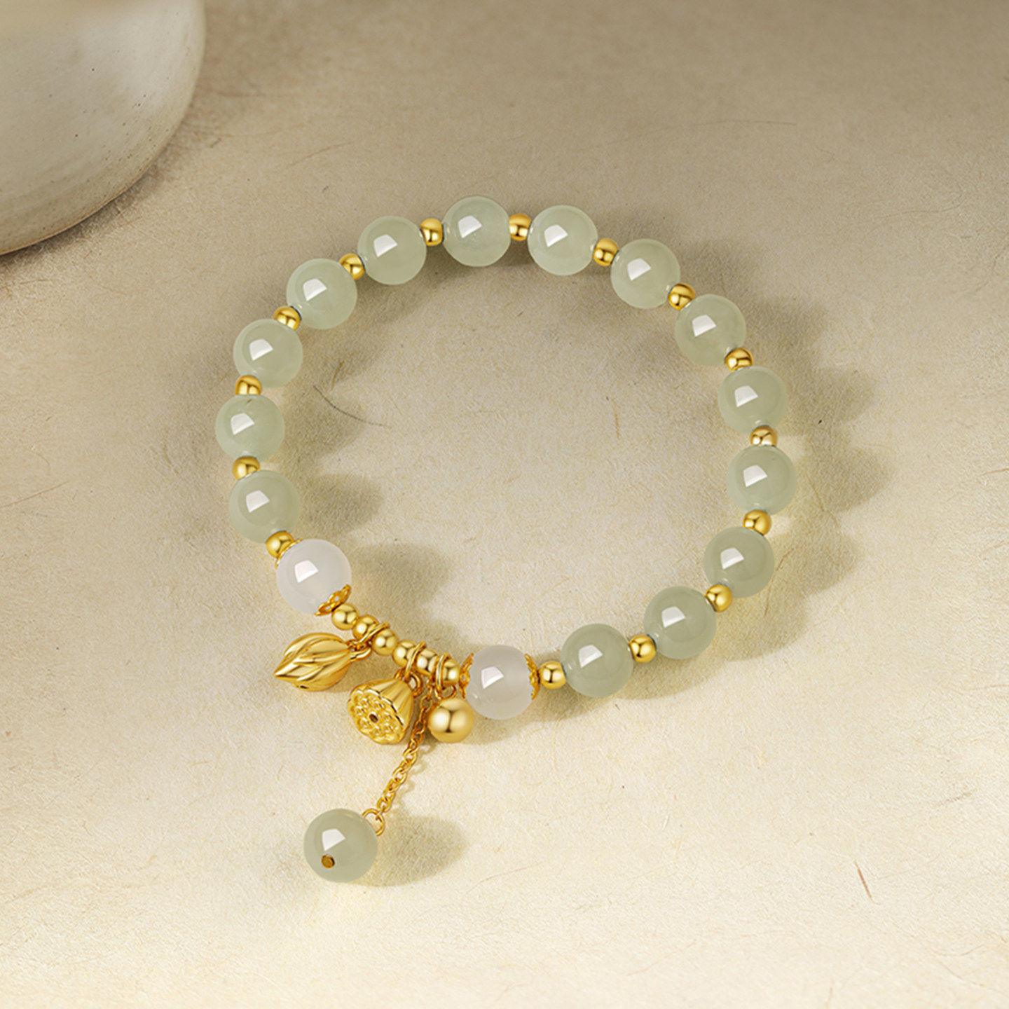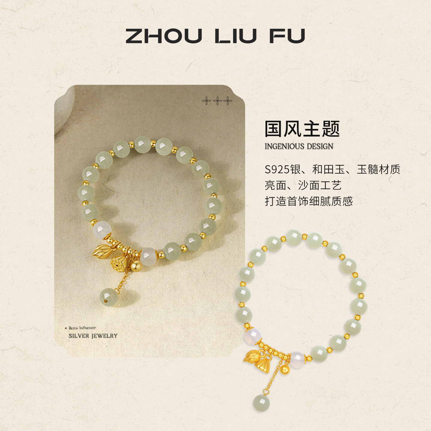 周六福和田玉中国风手串莲花玉髓手链时尚S925银送女友圣诞礼物